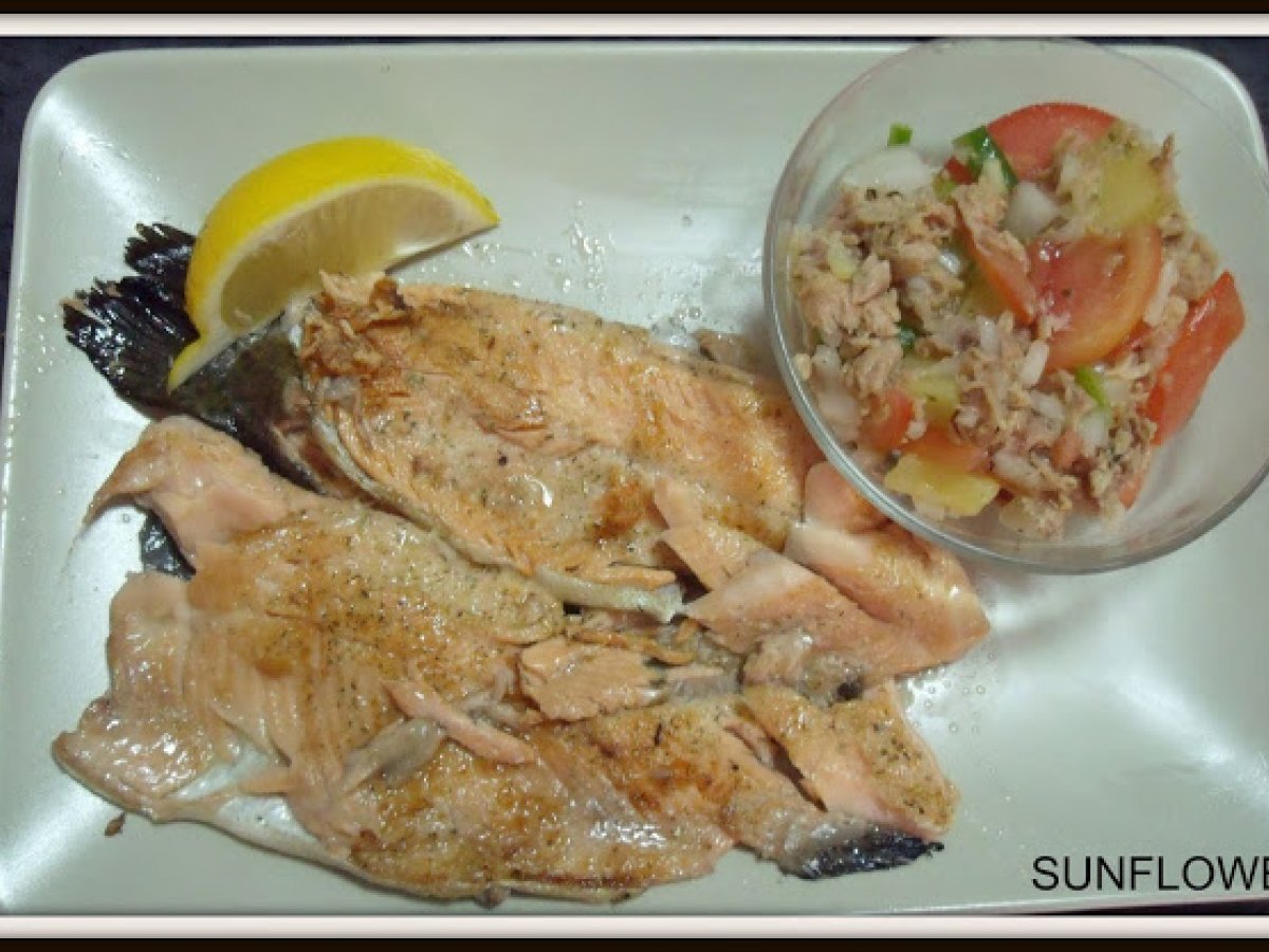 Trucha a la plancha PlatoFácil45 min233 Kcal Enviar esta receta a un amigo Imprimir esta página Preguntar al autor Publicar la foto de esta receta Ingredientes 4 4 truchas asalmonadas limpias de espinas Sal de romero y limón Harina para sellar antes de poner a la plancha Limón para servir