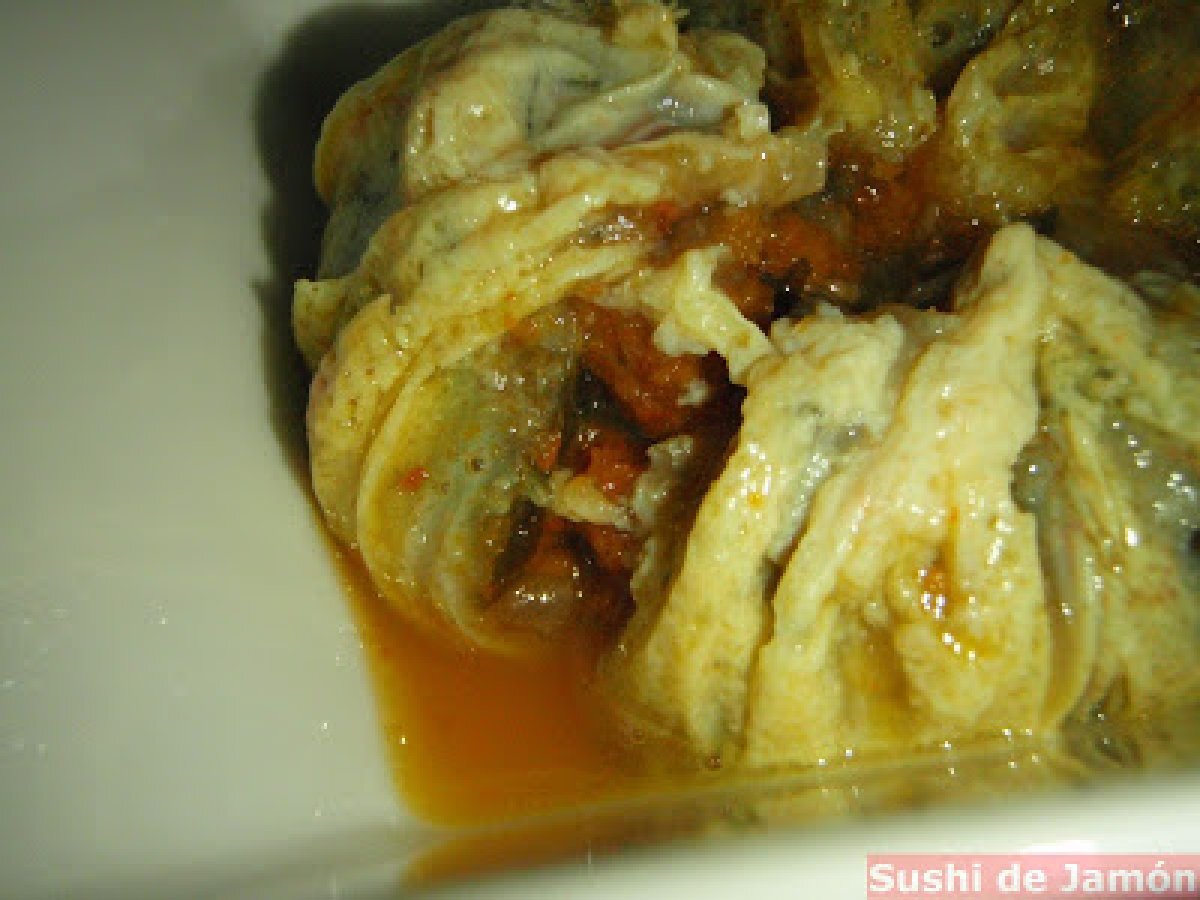 - Batimos las yemas y las mezclamos con el caviar de erizo, la cebolla, el alga y una pizca de sal. En papel film, untado con un poco de aceite, repartimos la mezcla y hacemos "bolsitas", que atamos bien. Lo escaldamos en agua hirviendo un minuto y medio y retiramos. Quitamos el plástico con mucho cuidad y revimos en un recipiente pequeño.