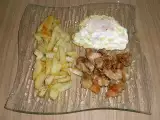 Ingredientes: 10 salchichas de pollo 300 g de patatas para freír 1 vaso de vino blanco 3 cucharas de aceite oliva 5 cucharas de de tomate frito 1 toque de...