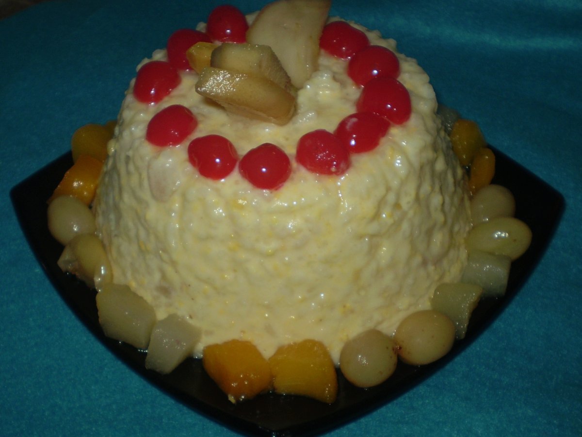 Arroz dulce a la francesa PostreMedio1 hora89300 Kcal Enviar esta receta a un amigo Imprimir esta página Preguntar al autor Publicar la foto de esta receta Ingredientes 4 100grm de arroz 1 cucharada de gelatina 4 vasos de leche 4 cucharadas de kirsch 100grm de fruta confitada 25 gro de mantequilla 100grm de azúcar 4 yemas de huevo Vainilla 250grm de nata Aceite