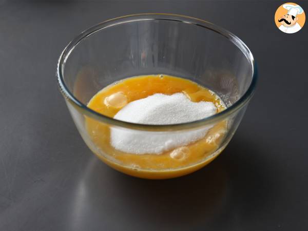 Batir los huevos y el azúcar hasta que la mezcla blanquee.