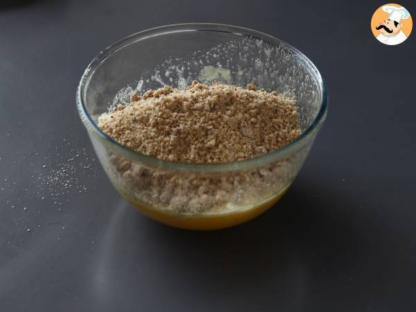 Añadir la avellana en polvo y mezclar bien. Por último, verter la mantequilla derretida y mezclar hasta obtener una mezcla homogénea.