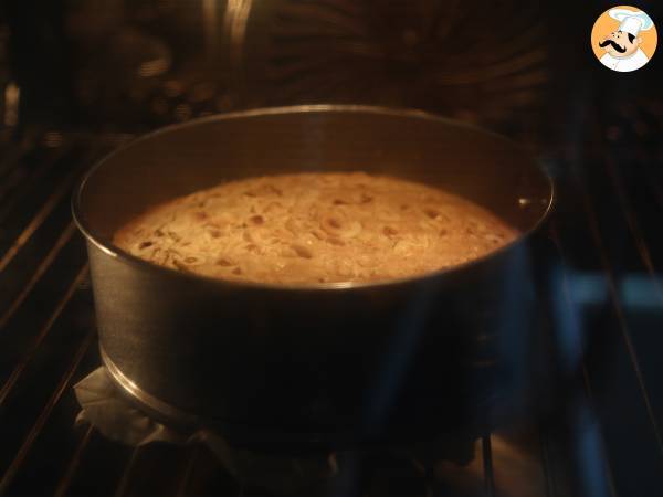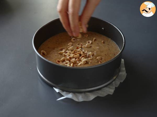 Verter la masa en un molde desmontable engrasado y forrado con papel sulfurizado. Cubrir la parte superior del bizcocho con las avellanas tostadas trituradas.