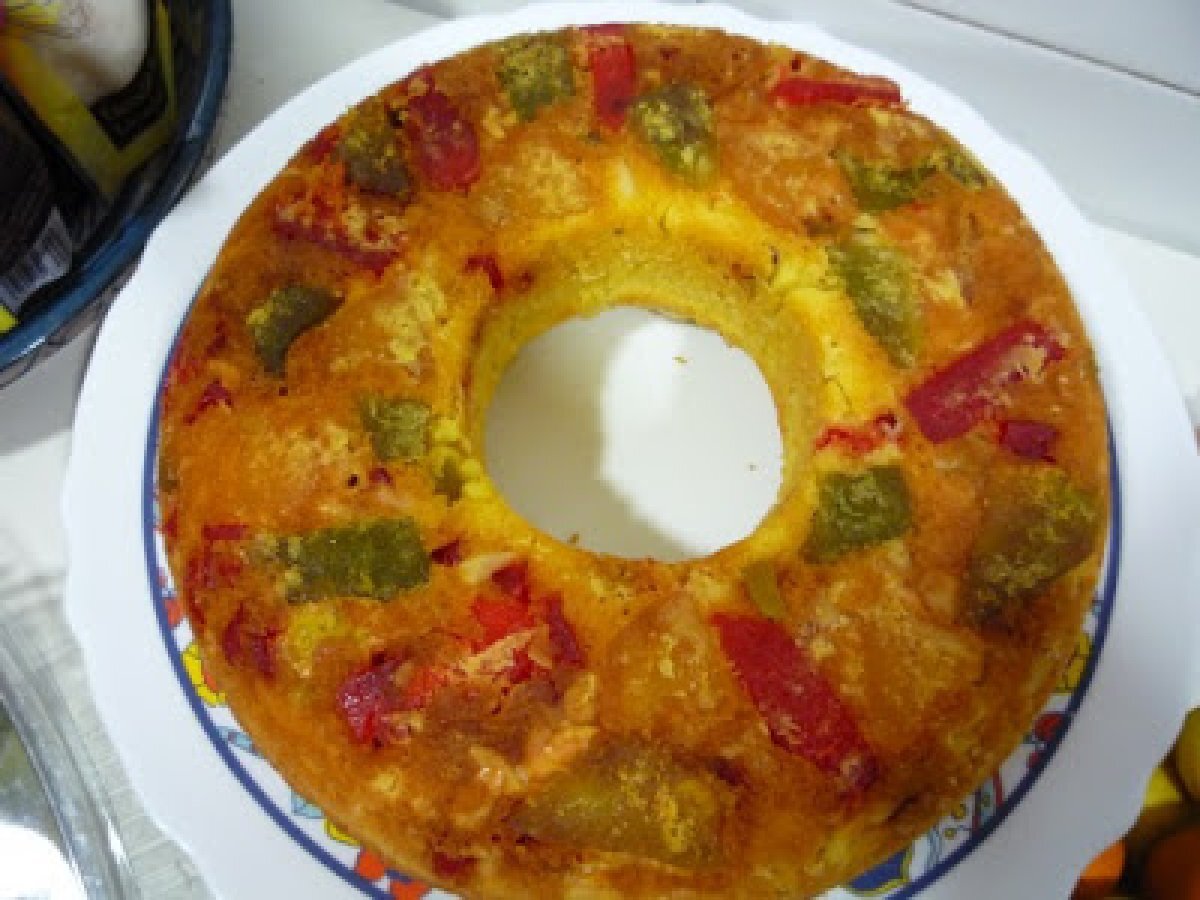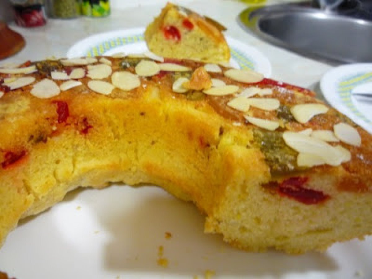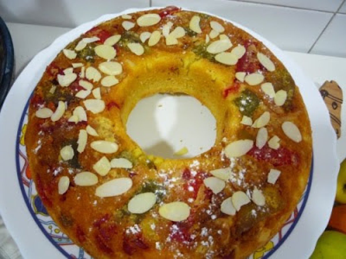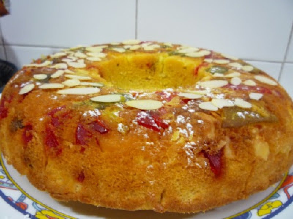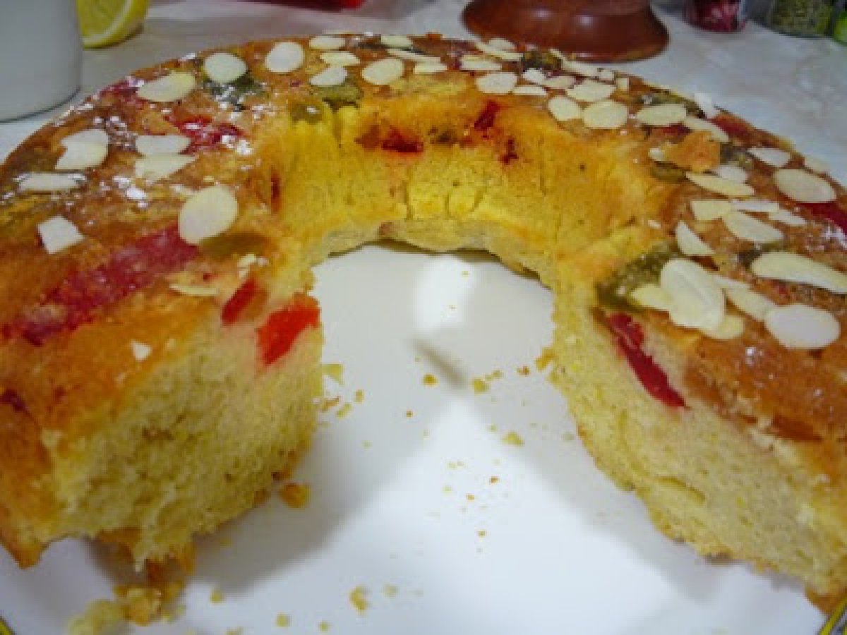 Bizcocho roscón de reyes AnteriorSiguiente PostreFácil1 hora754 Kcal Enviar esta receta a un amigo Imprimir esta página Preguntar al autor Publicar la foto de esta receta Ingredientes 4 250 g de harina de repostería 100 g de fruta confitada variada 125 g de mantequilla 150 g de azúcar glass 1 cucharadita de glucosa o de miel, (si no utilizamos ninguna de las dos opciones poner algo más de azúcar como 180-200 g) 3 huevos 70 ml de leche 2 cucharadas de agua de azahar, ½ sobre de levadura en polvo Opcional: trocitos de almendra (granillo de almendra crudo), Costo estimado: 3.53Euros€ (0.88€/porción)