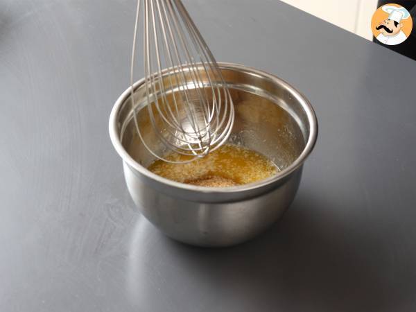 Precalentar el horno a 180°C con función ventilador (de no tenerla ponga calor arriba y abajo). En un cuenco, añadimos el huevo y el azúcar moreno y mezclamos.