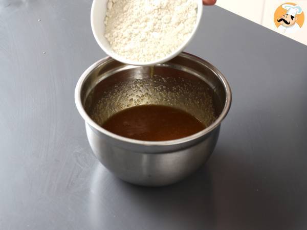 Añadimos la mantequilla fundida y el extracto de vainilla, y mezclamos de nuevo. Ahora, añadiremos la harina (mejor tamizada) y la pizca de sal. Mezclamos pero no demasiado, solo lo suficiente para que los ingredientes se hayan mezclado bien y no queden grumos en la harina.