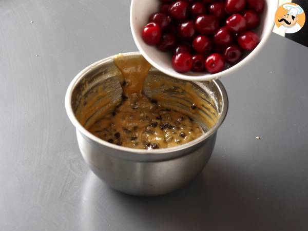 Por último, añadimos las pepitas de chocolate y las cerezas lavadas y deshuesadas (puedes añadirlas troceadas si lo deseas).