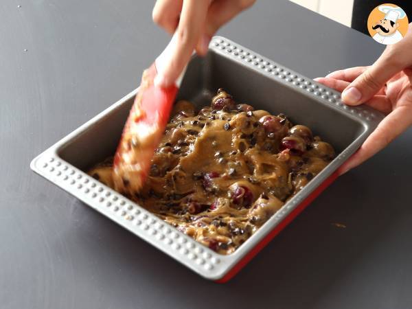 Vertemos la masa en un molde bien engrasado. Con la ayuda de una espátula o una cuchara procura que las cerezas queden bien distribuidas por toda la masa.