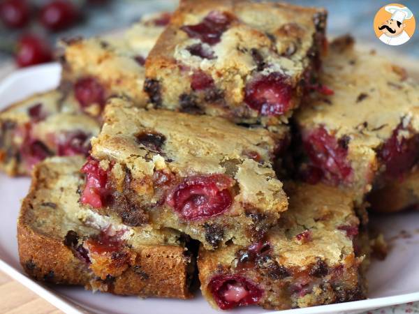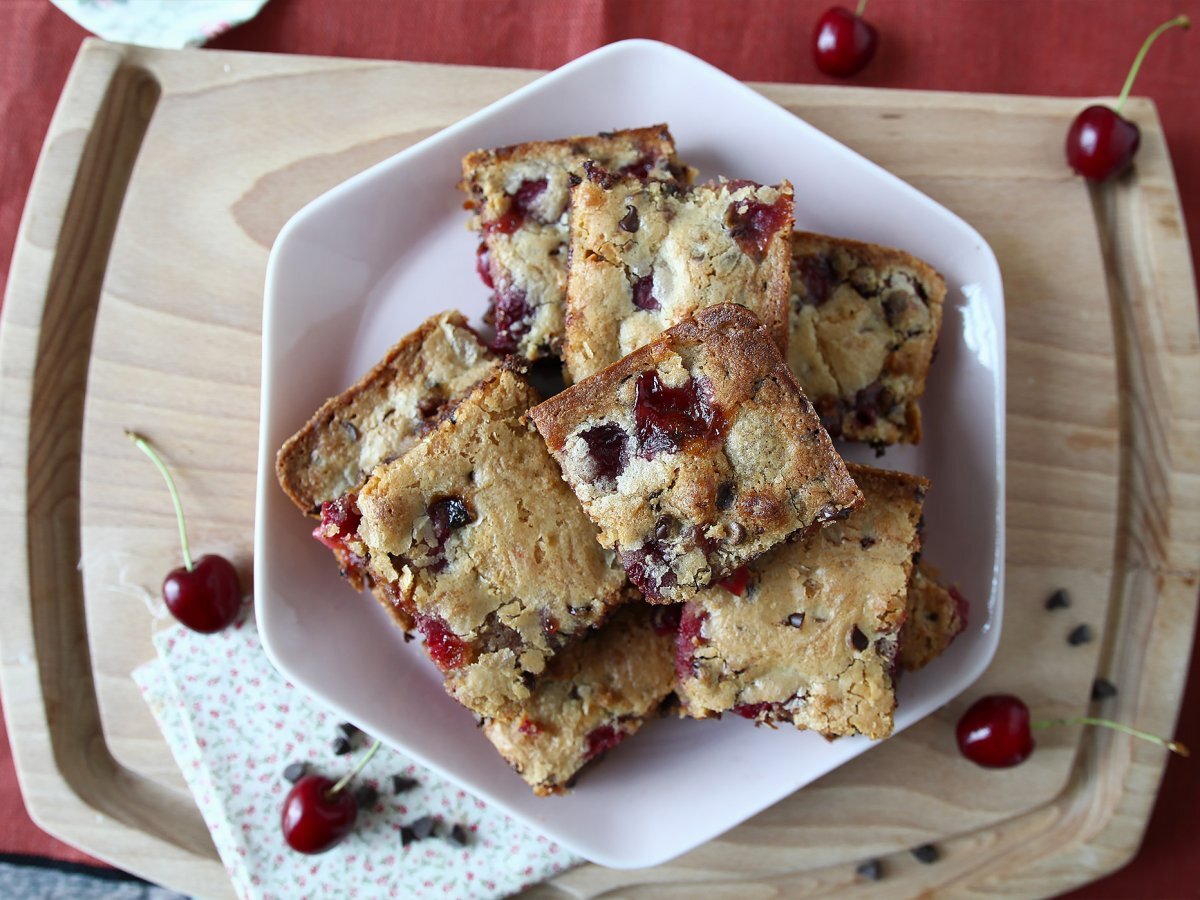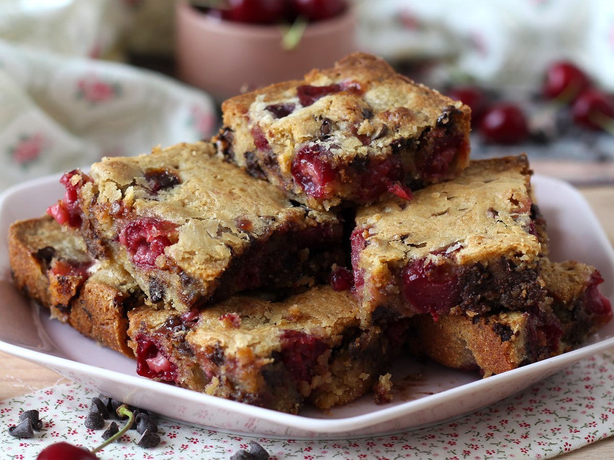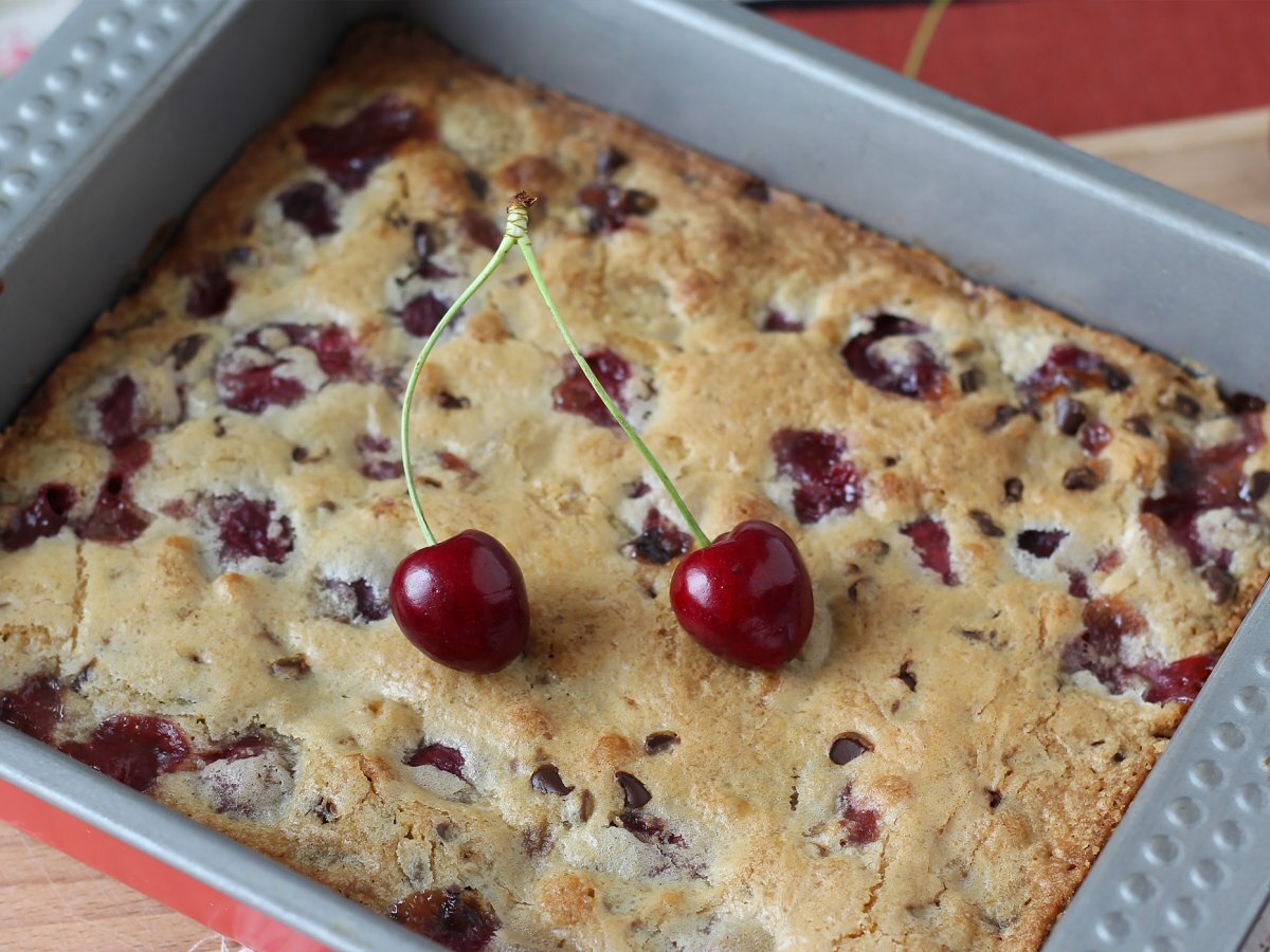 Blondie de cerezas y chocolate, un crujiente pastel de fruta realmente delicioso
