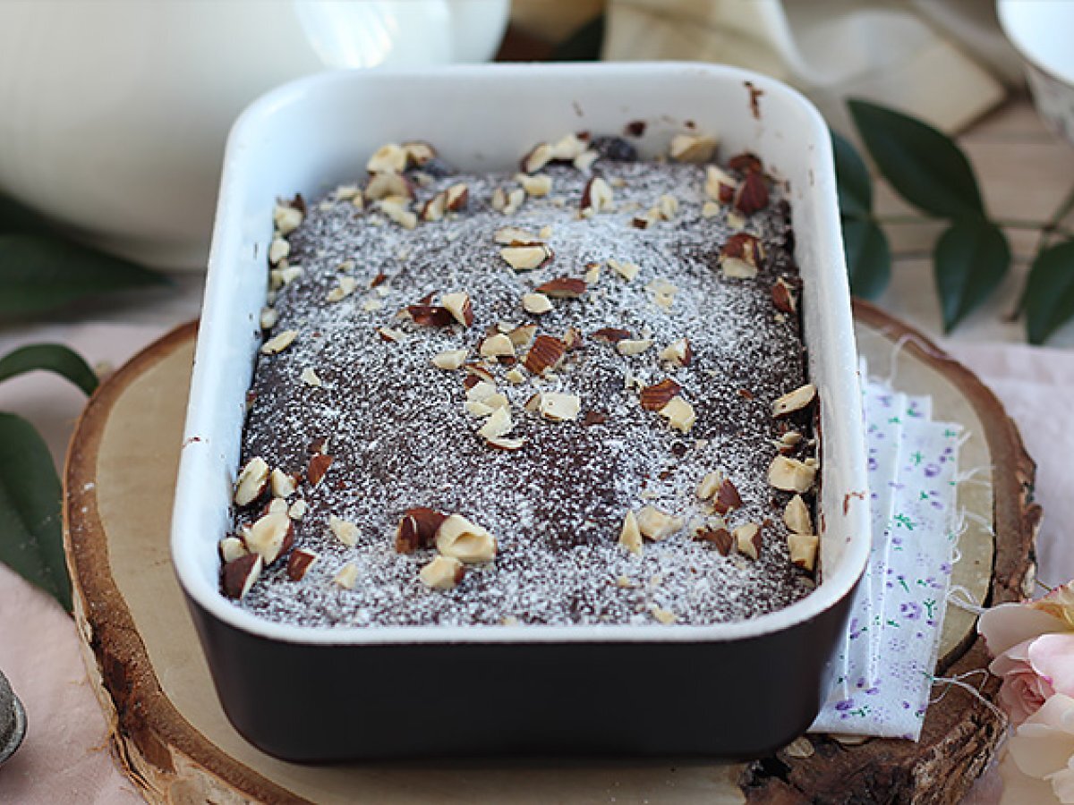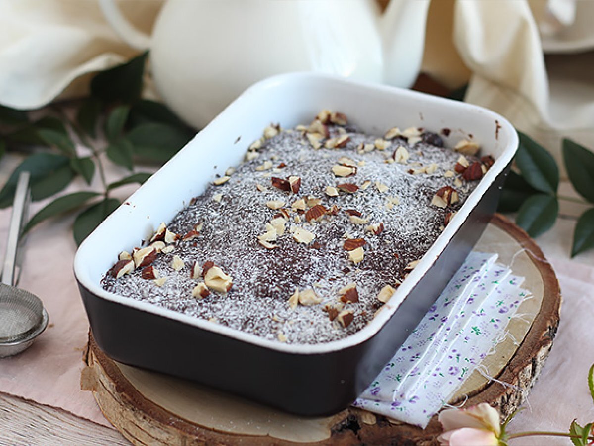 Saca del microondas y déjalo enfriar por completo. Espolvorea azúcar glas por encima y coloca algunas avellanas troceadas. Y listo!
