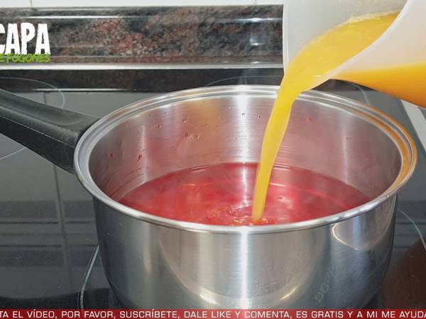 Mezclamos y añadimos el zumo de naranja y a fuego medio dejamos que se vaya calentando para que el azúcar se vaya disolviendo.