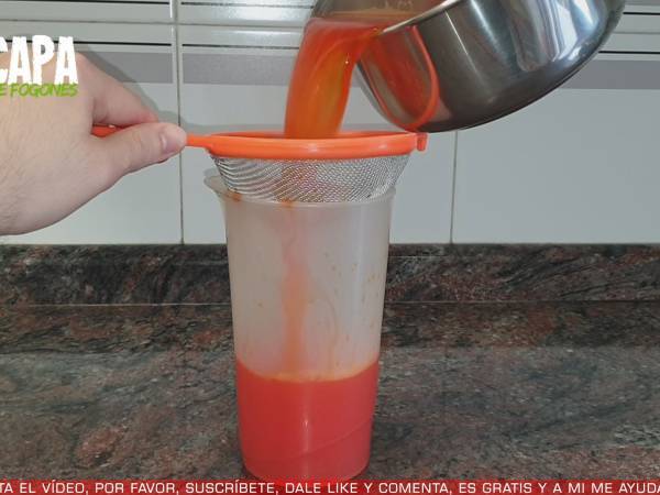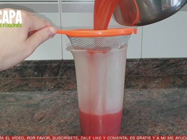 Después lo pasamos a un recipiente colándolo para que no nos caiga la pulpa de la naranja y dejamos que se atempere.