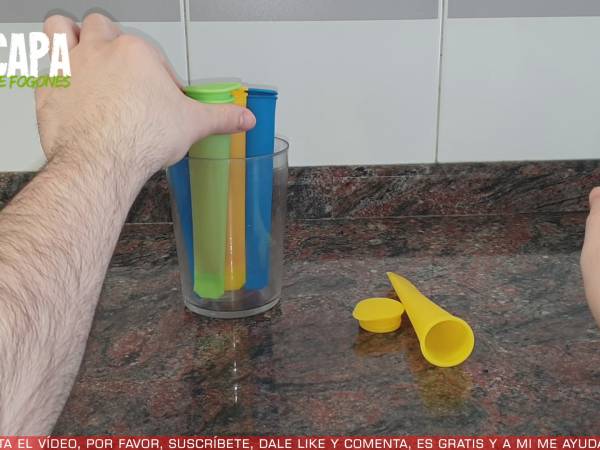 Colocamos los calippo en un vaso alto para que queden lo más rectos posible y los llevamos al congelador hasta que estén bien congelados.