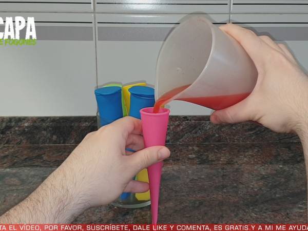Y ahora solo falta rellenar los calippos en estos moldes de silicona. No los llenéis hasta arriba del todo porque al congelarse el calippo crece de tamaño.
