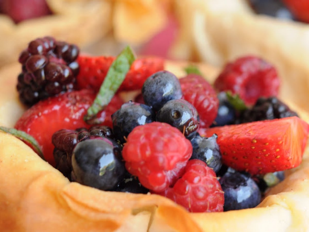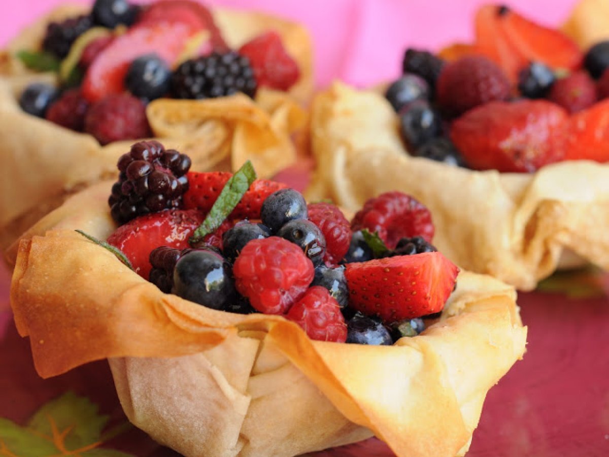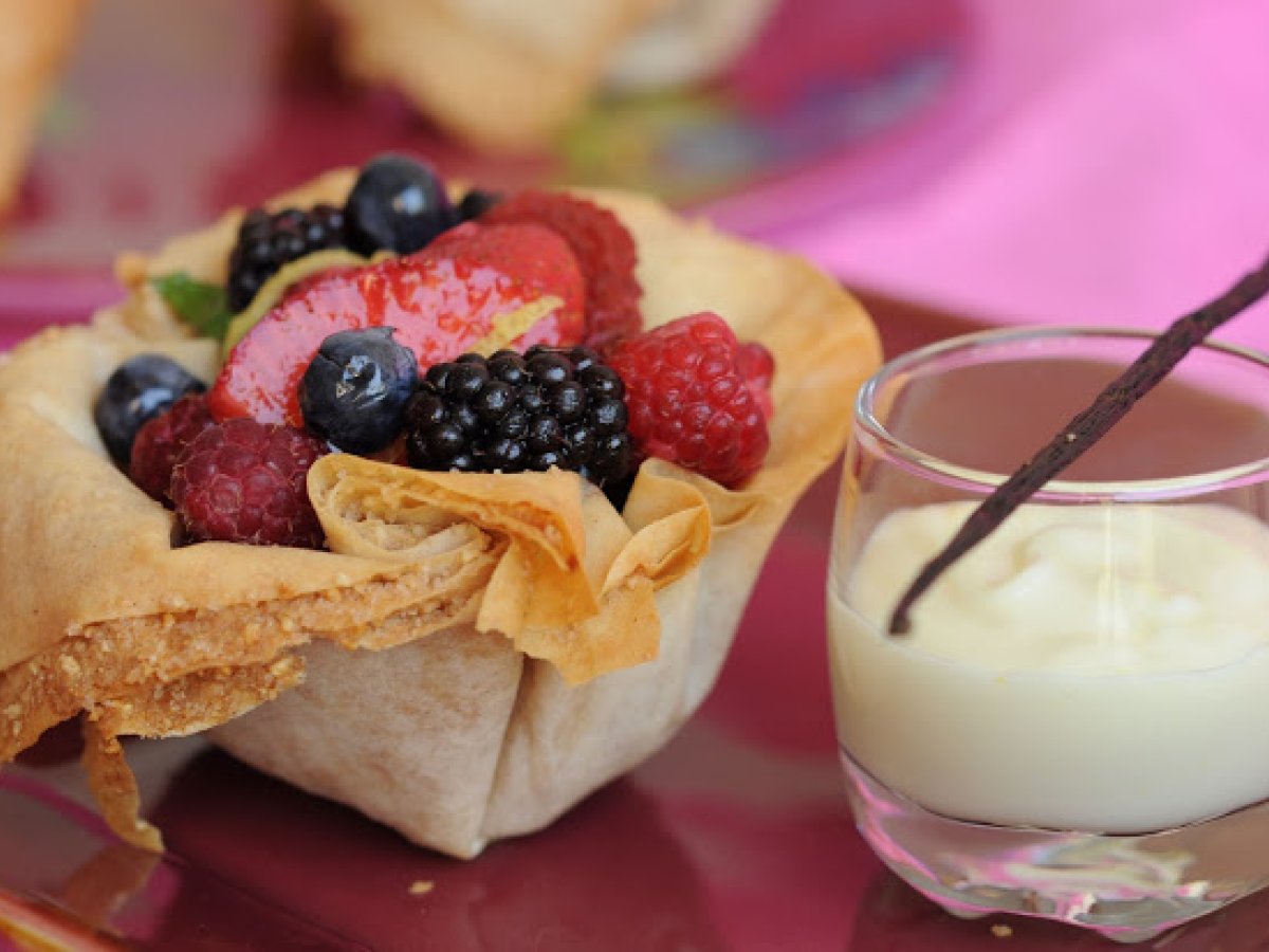 Para la ensalada de frutos rojos, juntar toda la fruta con el almíbar, menta y ralladura de limón. - Al momento de servir, rellenar los canastos con la ensalada de frutos, acompañar con helado o crema de yogurt y chocolate blanco.