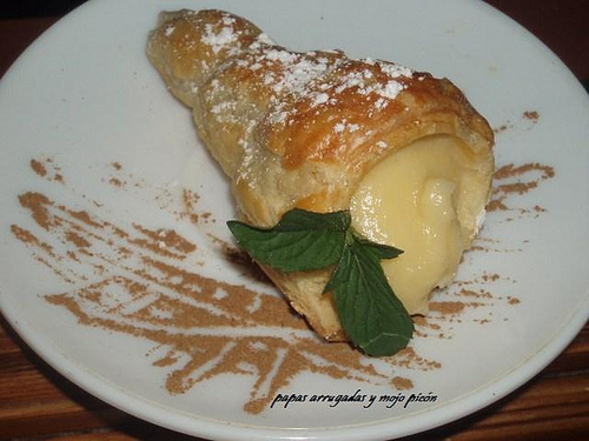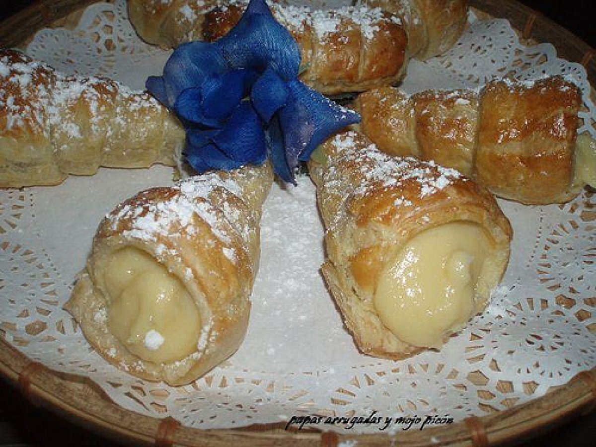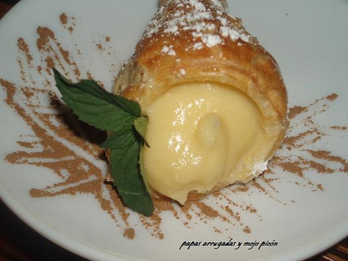 Canutillos con crema de melón AnteriorSiguiente PostreFácil35 min701 Kcal Enviar esta receta a un amigo Imprimir esta página Preguntar al autor Publicar la foto de esta receta Una receta muy sencilla, pero muy dulce. Ingredientes 3 Una lámina de hojaldre 2 huevos 3 yemas de huevo 350 gr. de melón 80 gr. de azúcar 50 gr. de harina de maíz refinada (maizena) 1 cucharadita de canela Para decorar: azúcar glasé y unas hojas de menta