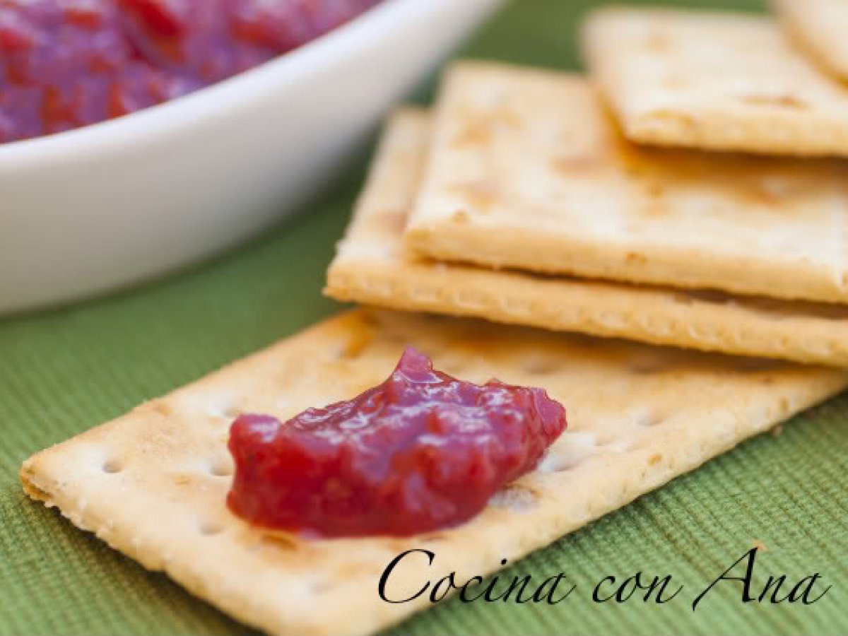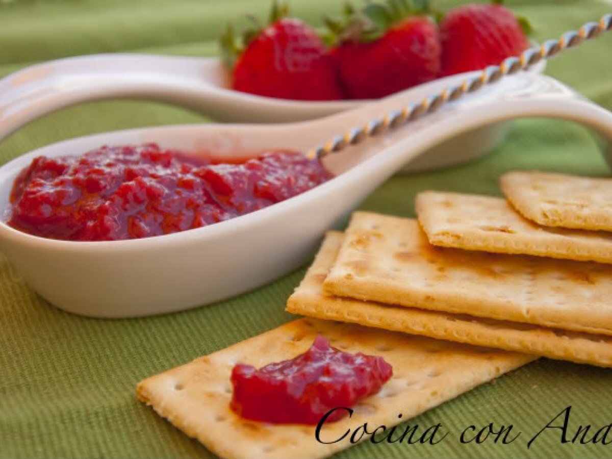 Chutney de fresas AnteriorSiguiente PostreMedio55 min195 Kcal Enviar esta receta a un amigo Imprimir esta página Preguntar al autor Publicar la foto de esta receta Ingredientes 4 500 gr de fresas 1 guindilla 1 cebolleta tierna 150 gr. de azúcar moreno 80 gr. de vinagre de manzana 1/2 cucharadita de jenjibre molido Costo estimado: 5.78Euros€ (1.44€/porción)
