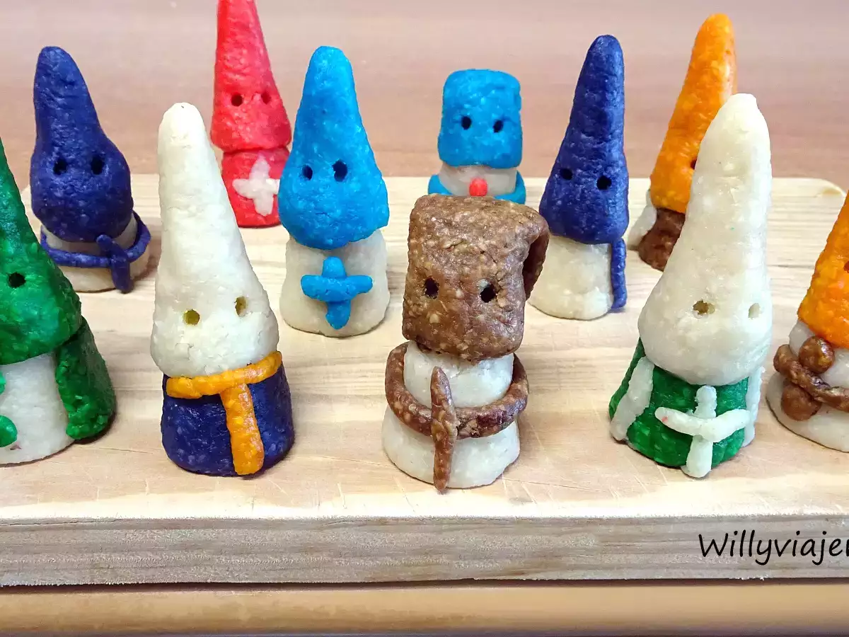 - Cogemos masa de otro color y hacemos lo mismo, pero esta vez presionaremos con un dedo la base para hacerle un hueco que superpondremos en el cono de coco para formar el capirote. Con un palillo le hacemos dos agujeritos simulando los ojos y podemos decorarle la parte del cuerpo con tiritas de masa de color formando cruces, botones, cordones, etc e incluso hacerles una capa con un trocito rectangular de masa.
