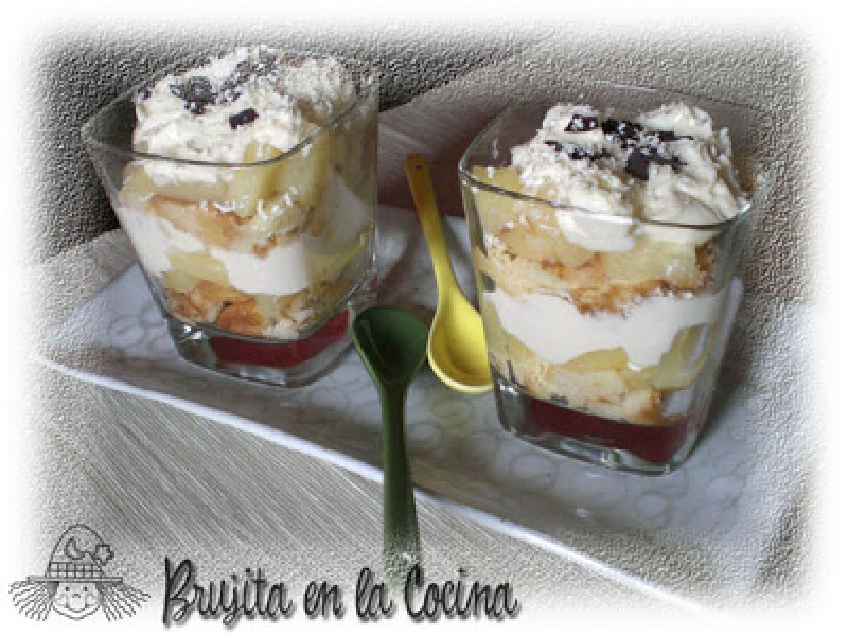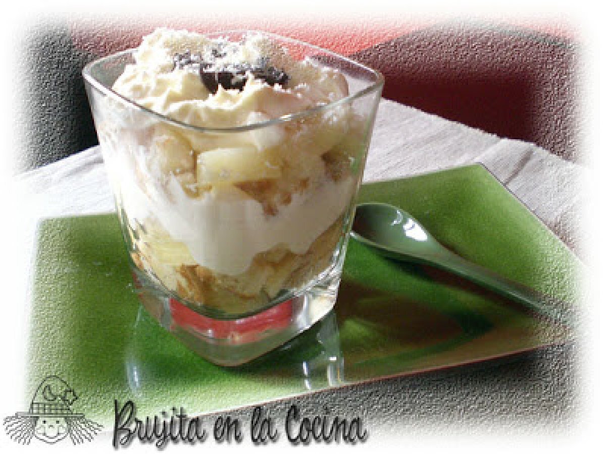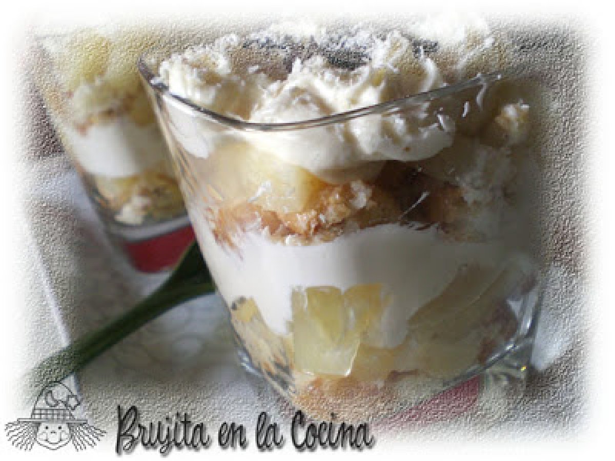 Copa de tiramisú de piña AnteriorSiguiente PostreFácil25 min969 Kcal Enviar esta receta a un amigo Imprimir esta página Preguntar al autor Publicar la foto de esta receta Ingredientes 2 250 g de mascarpone (1 terrina) 2 natillas de vainilla 450 g piña al natural 12 bizcochos de soletilla chocolate blanco lascas de chocolate Costo estimado: 5.9Euros€ (2.95€/porción)