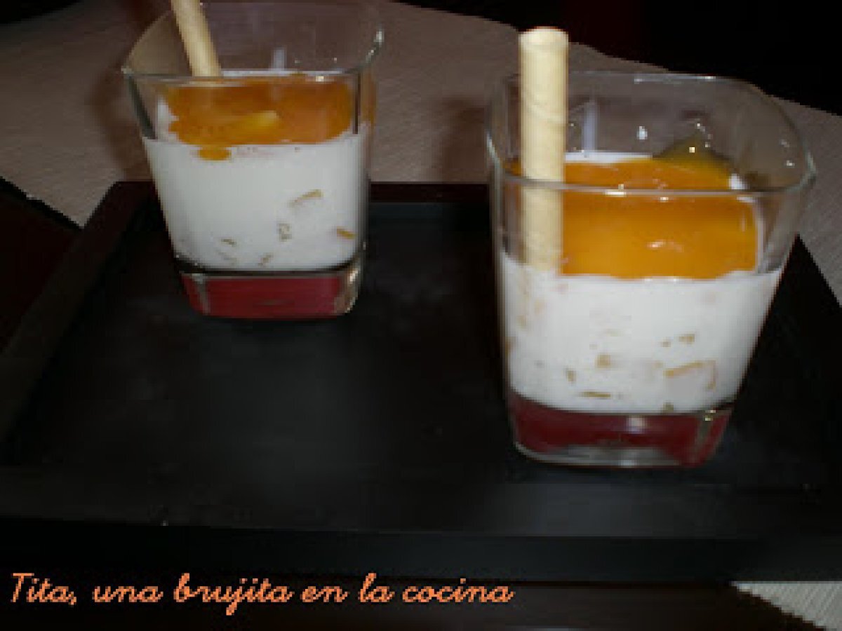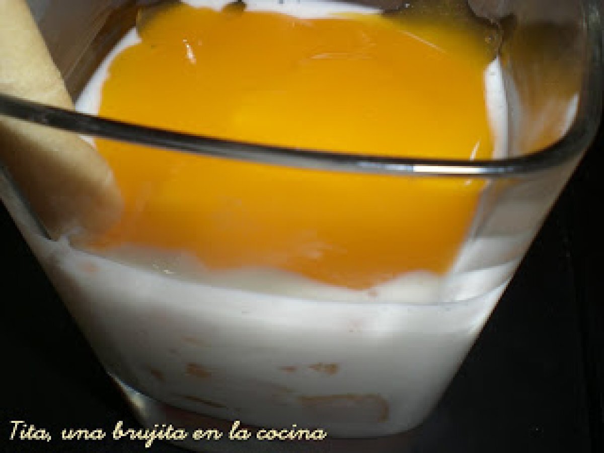 - Una vez echo reservamos y dejamos enfriar. Troceamos la fruta y lo echamos en el bol de la mezcla de yogur y leche condensada, envolvemos bien todo y lo vamos echando en vasitos, copas o el recipiente que hayamos elegido. Después añadimos la natilla tropical por encima.
