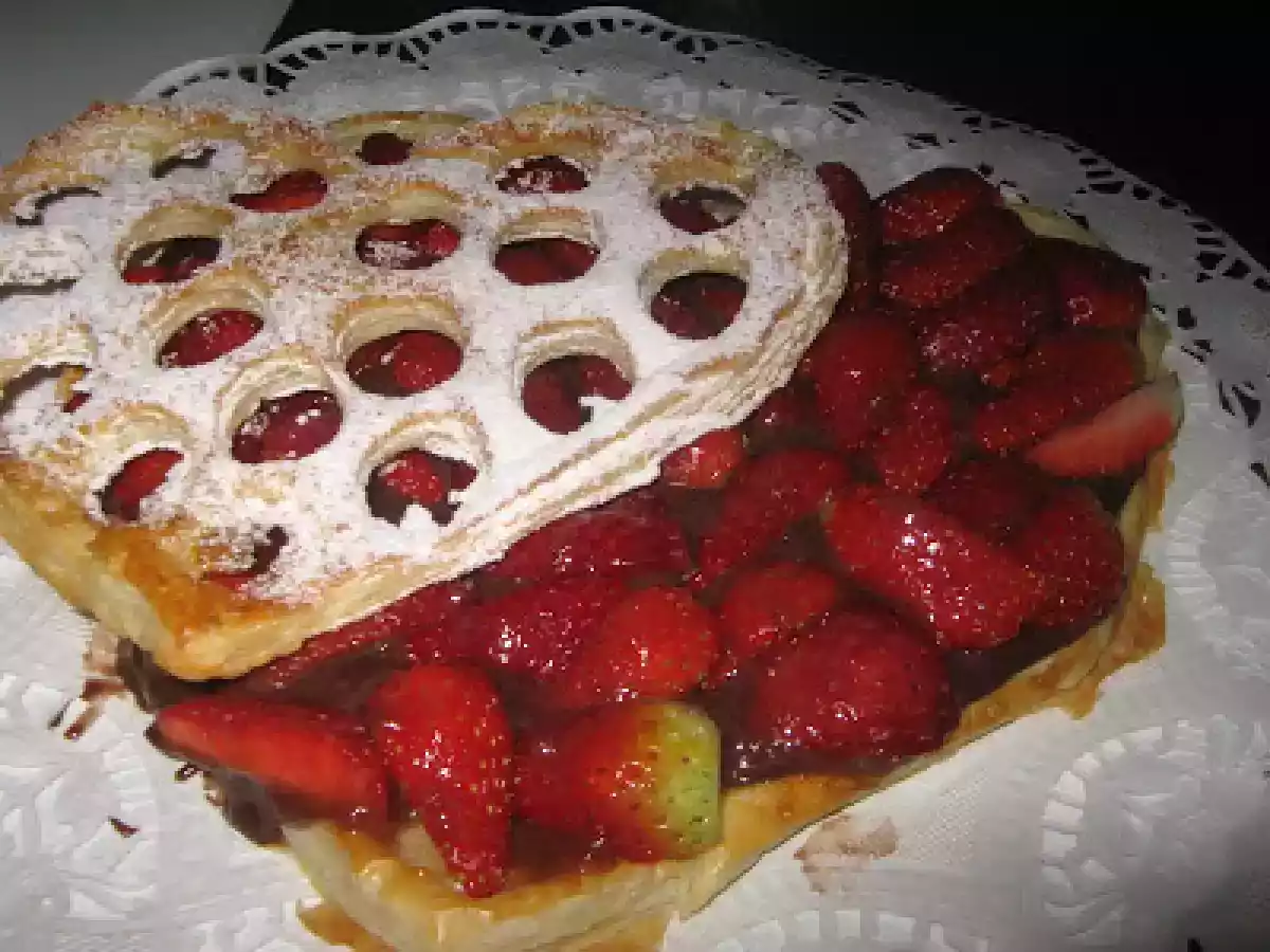 Corazón de hojaldre con crema de chocolate y fresas PostreFácil27 min564 Kcal Enviar esta receta a un amigo Imprimir esta página Preguntar al autor Publicar la foto de esta receta Ingredientes 4 1 lámina de hojaldre 250 g de fresones 4 cucharadas de mermelada de fresa 4 yemas de huevo la piel de un limón 500 g de leche 50 g de maicena 3 cucharadas soperas de cacao puro Costo estimado: 5.4Euros€ (1.35€/porción)