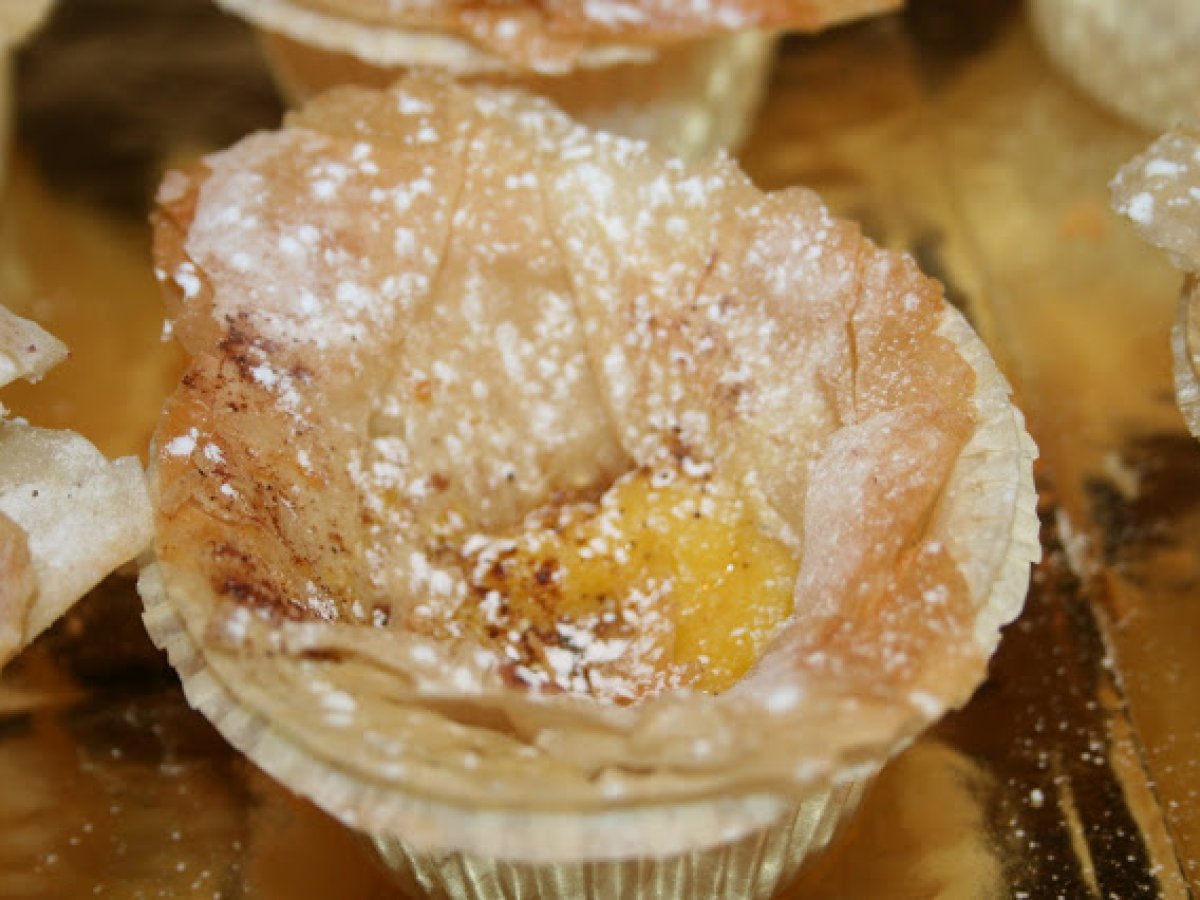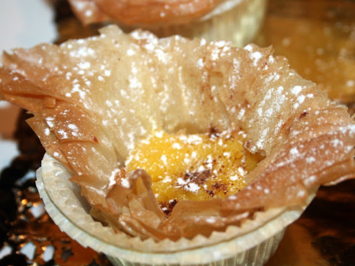 Crema de almendras en pasta filo AnteriorSiguiente PostreMedio35 min Enviar esta receta a un amigo Imprimir esta página Preguntar al autor Publicar la foto de esta receta Ingredientes 4 1 paquete de masa filo 250 g de nata 250 g de leche 150 g de azucar 70 g de harina 50 g de harina de almendras 5 yemas de huevo 1 palo de canela corteza amarilla de limon azucar glass canela para adornar Molde de muffins con compartimentos mantequilla derretida
