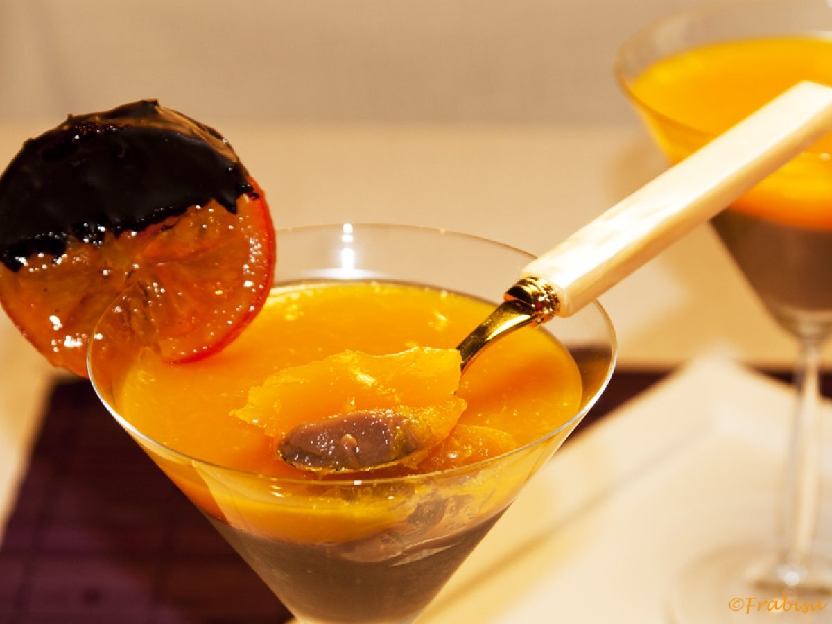 Crema de chocolate y naranja AnteriorSiguiente PostreFácil35 min967 Kcal Enviar esta receta a un amigo Imprimir esta página Preguntar al autor Publicar la foto de esta receta Ingredientes 2 500 g de leche 2 huevos 1 poquito de vainilla 30 g de maizena 70 g de azúcar 4 cucharadas de cacao en polvo 500 g de zumo de naranja natural 2 huevos 40 g de maizena 100 g de azúcar 1 hoja de gelatina Costo estimado: 3.28Euros€ (1.64€/porción)