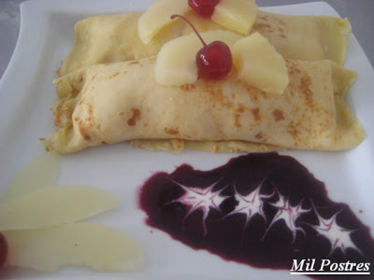 Crepes de crema y frutas con coulis de frutas rojas AnteriorSiguiente PostreFácil50 min568 Kcal Enviar esta receta a un amigo Imprimir esta página Preguntar al autor Publicar la foto de esta receta Un buen postre para una buena digestión. Ingredientes 3 150 gr. de harina 3 huevos 1/4 litro de leche 50 gr. de mantequilla 50 gr. de azúcar una pizca de sal 2 cucharadas soperas de brandy Para el relleno: fruta la que se desee pelada y cortada en dados azúcar al gusto Crema pastelera Coulis de frutas rojas variadas Costo estimado: 4.56Euros€ (1.52€/porción)