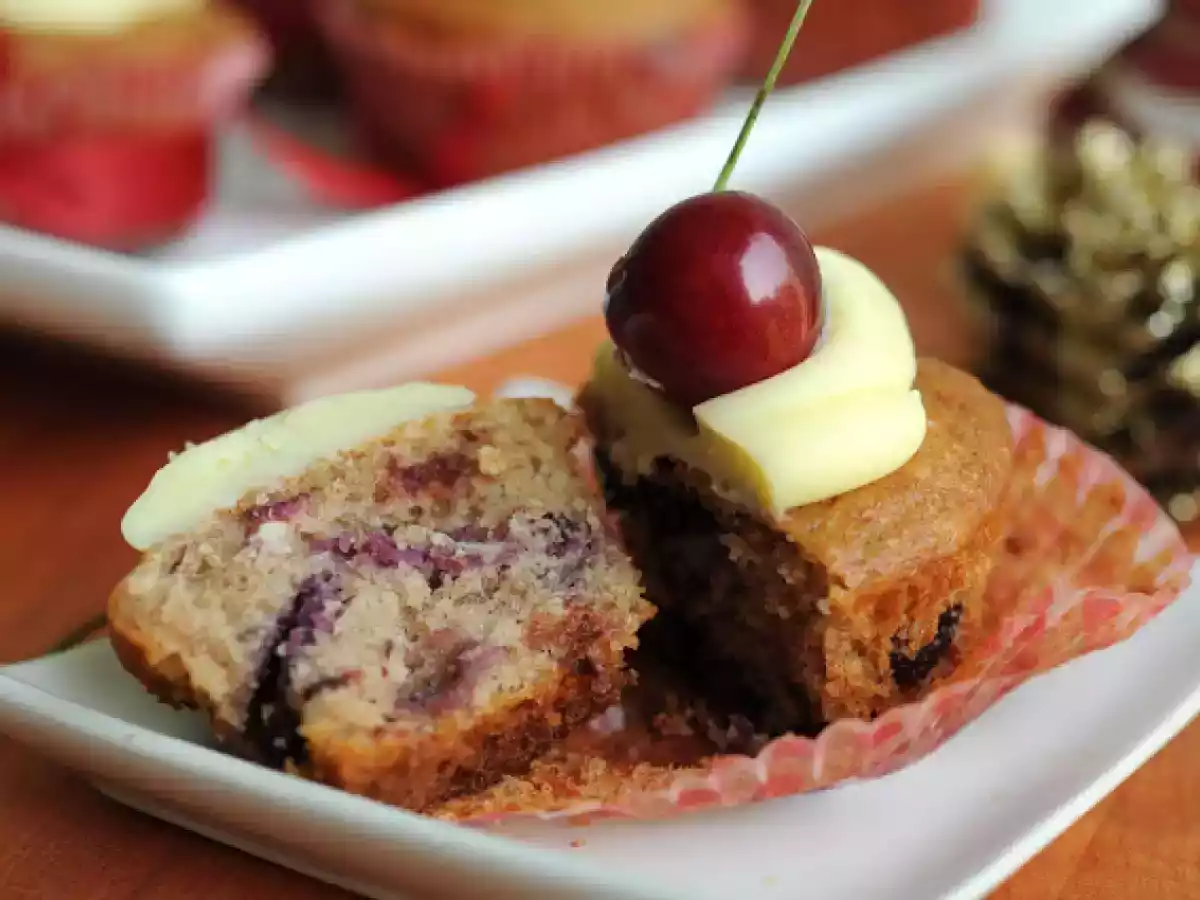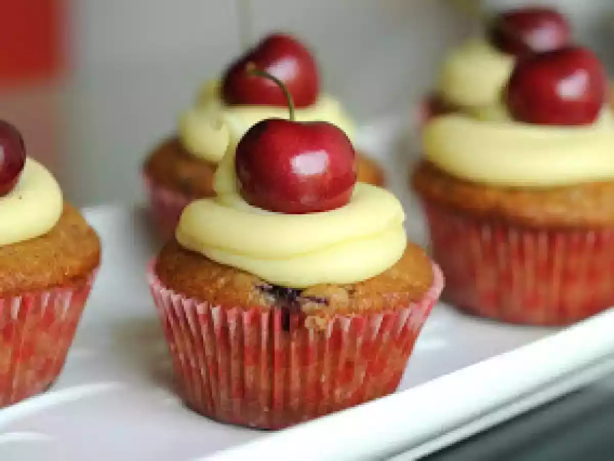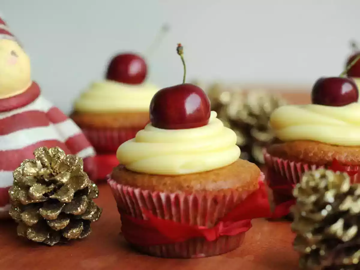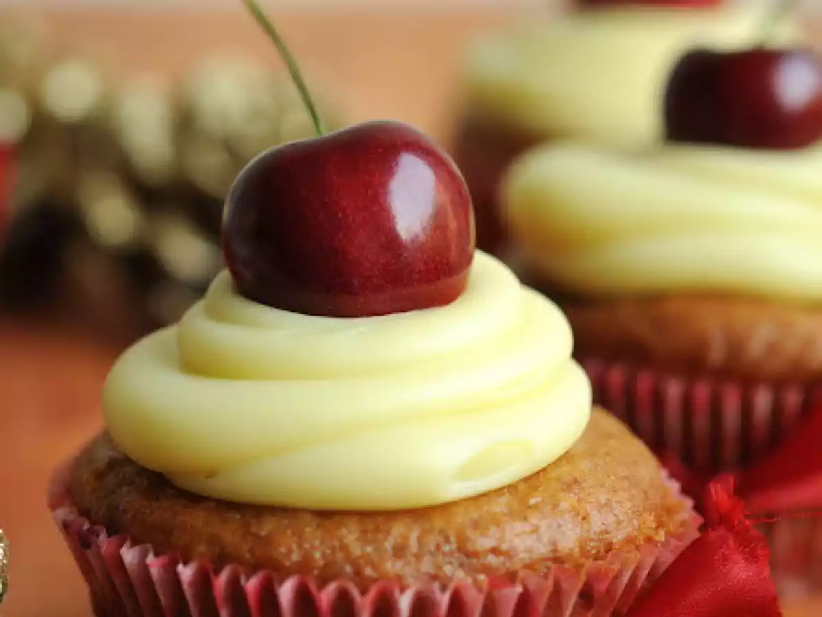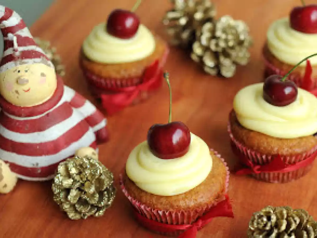 Cupcakes de cerezas con sabor a navidad AnteriorSiguiente PostreFácil1 h 5 m1295 Kcal Enviar esta receta a un amigo Imprimir esta página Preguntar al autor Publicar la foto de esta receta Ingredientes 4 1 taza de harina 1 taza de almendras molidas finas 2 cucharaditas de polvos de hornear 1 cucharadita de canela 1 cucharadita de jengibre en polvo ½ taza de azúcar granulada 170 g yogurt natural 2 huevos 3 cucharadas de aceite vegetal ¾ taza de guindas ácidas secas picadas 1 taza de cerezas picadas 300 g chocolate blanco picado 1 taza de crema