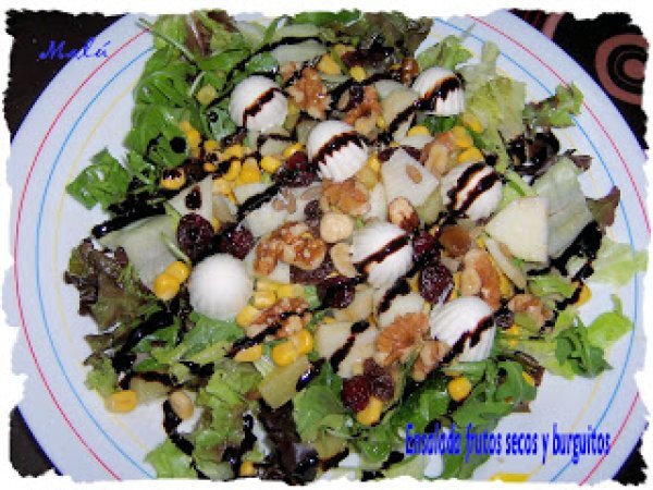 Ensalada de frutos secos y burguitos PostreFácil55 min Enviar esta receta a un amigo Imprimir esta página Preguntar al autor Publicar la foto de esta receta Ingredientes 4 Lechuga romana Lechuga de roble Rúcula Manzana verde fileteada Piña en su jugo troceada Maiz Nueces Avellanas Pipas de girasol peladas Pasas Burguitos de Arias Sal Aceite Crema de vinagre balsámico de módena