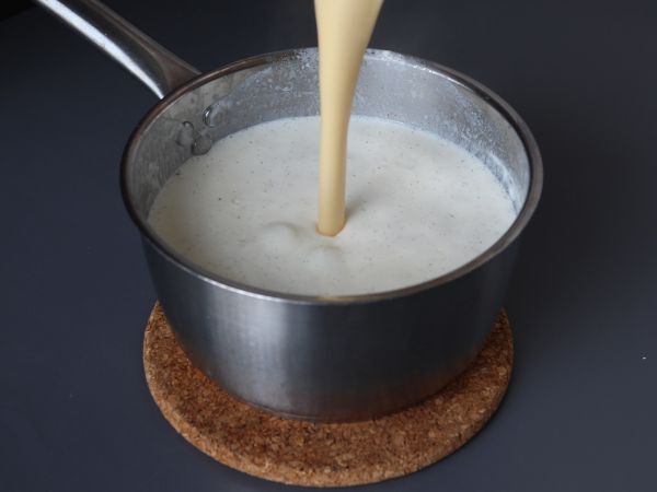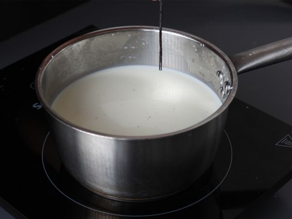 Vierte la leche en un cazo y caliéntala a fuego medio. Añade la vaina de vainilla abierta a lo largo.