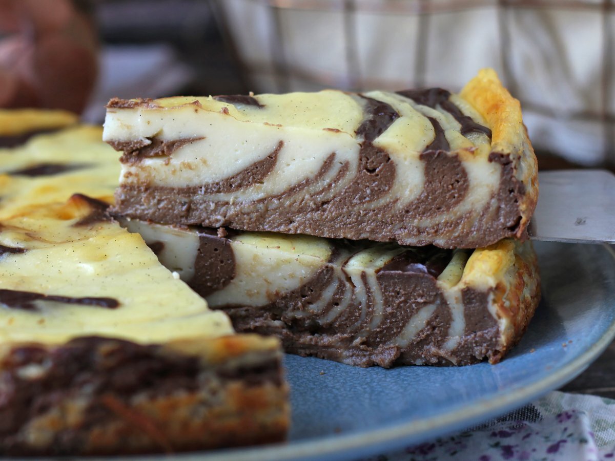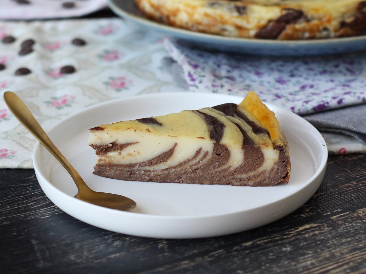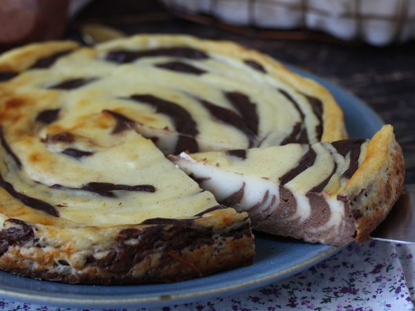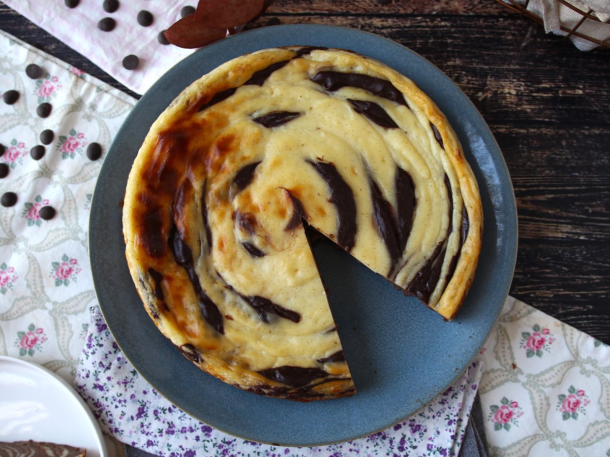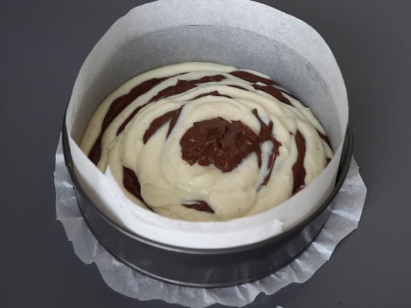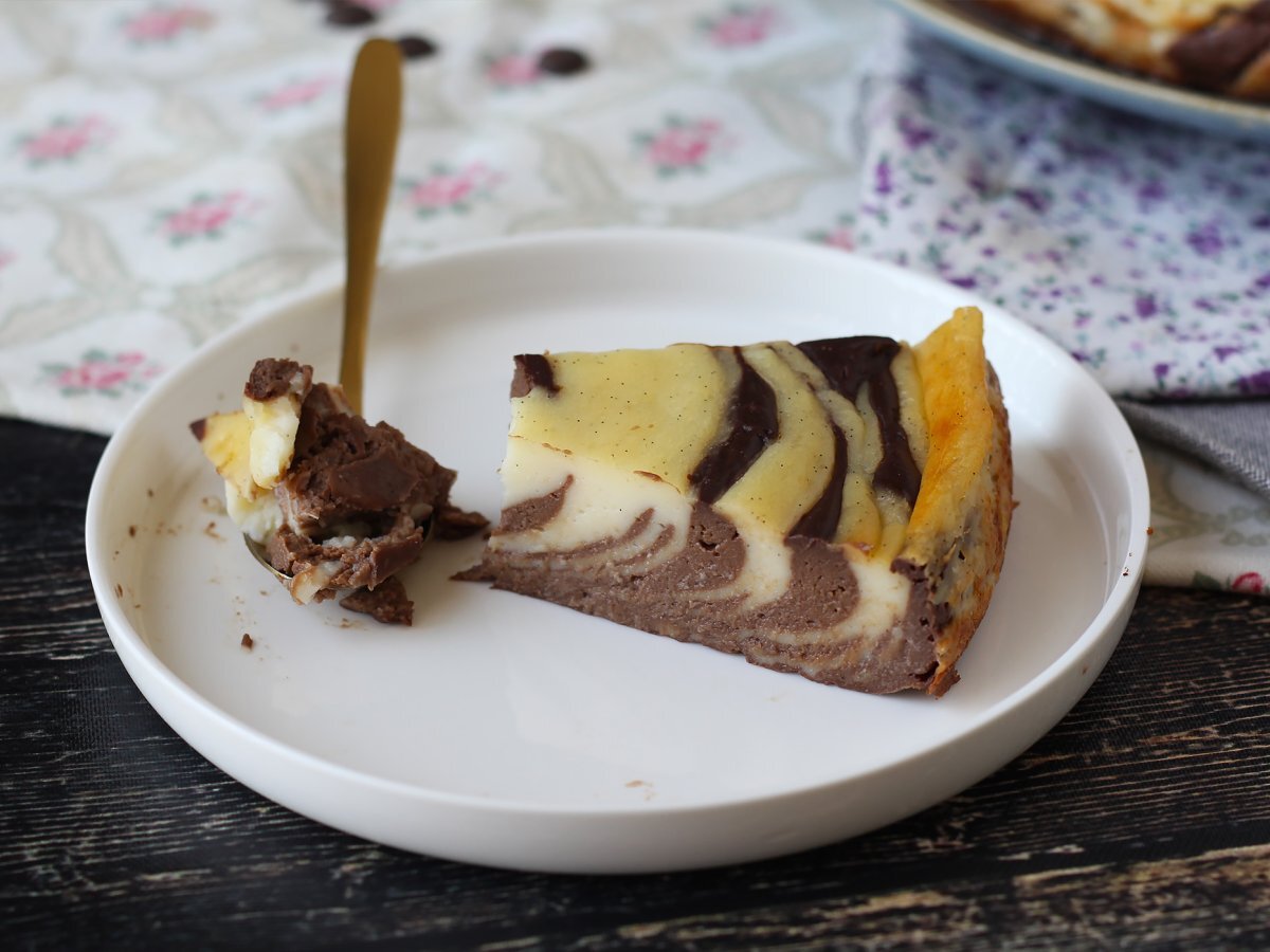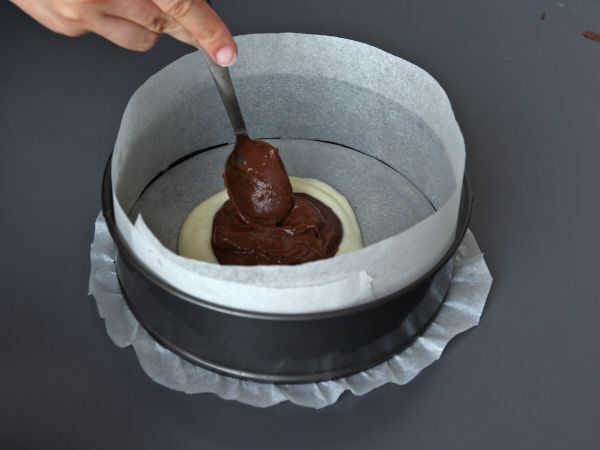Puedes alternar cucharadas iguales de crema de vainilla y de chocolate en el molde, creando un efecto "cebra". También puedes distribuir las cremas de forma aleatoria y luego pasar un palillo o brocheta para hacer un marmolado más desestructurado.