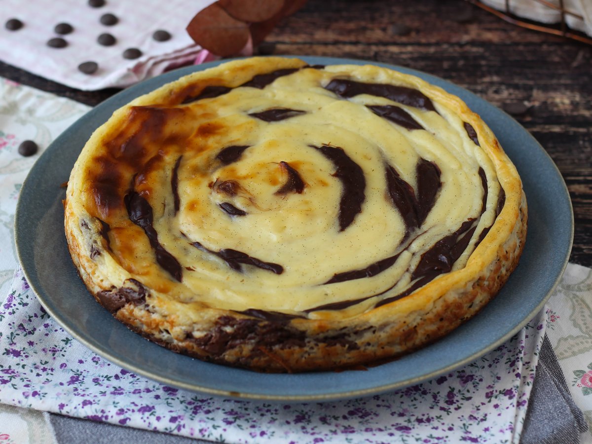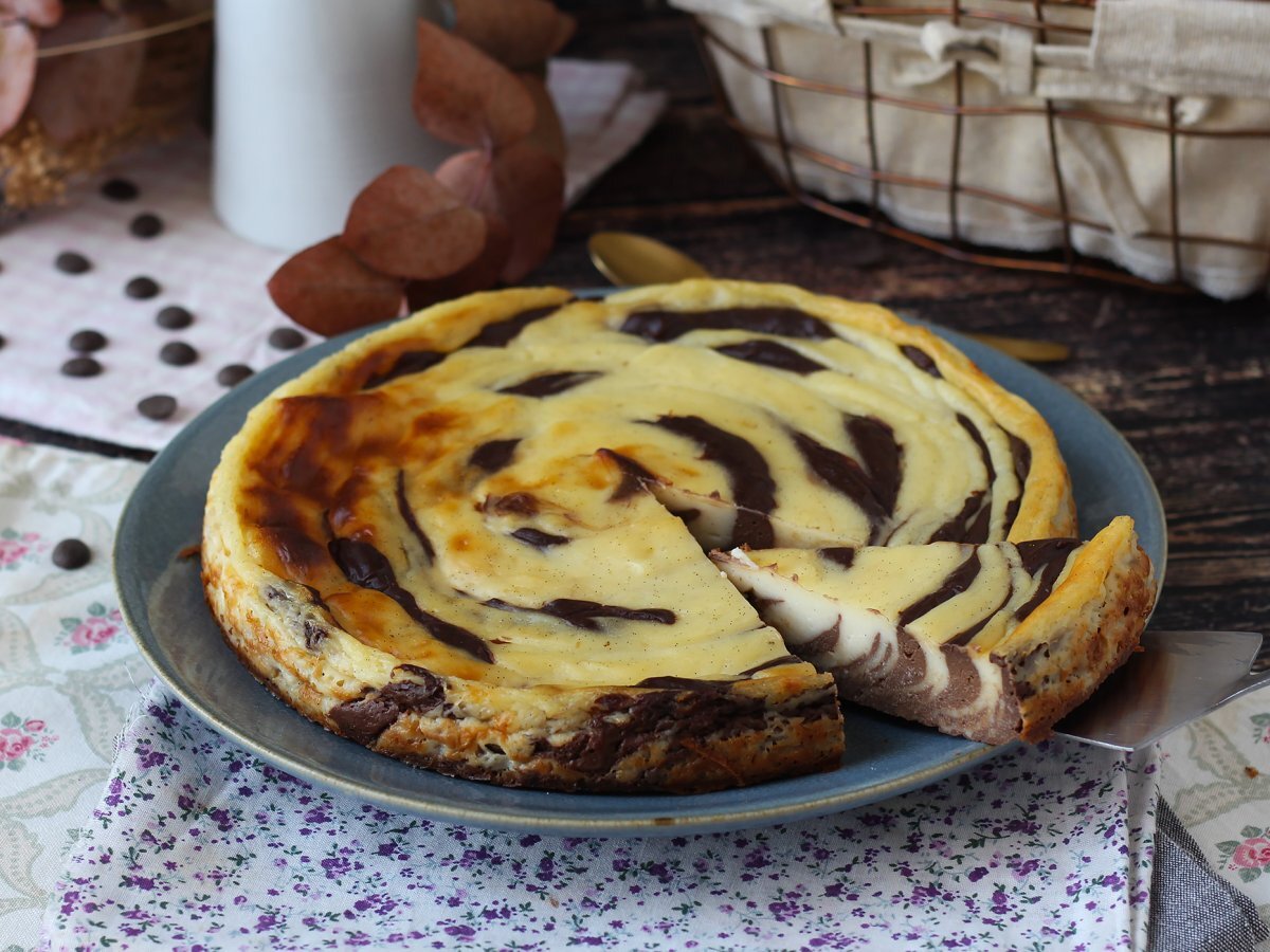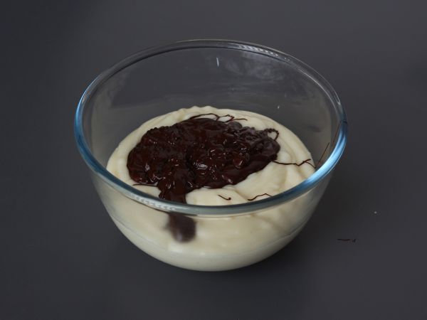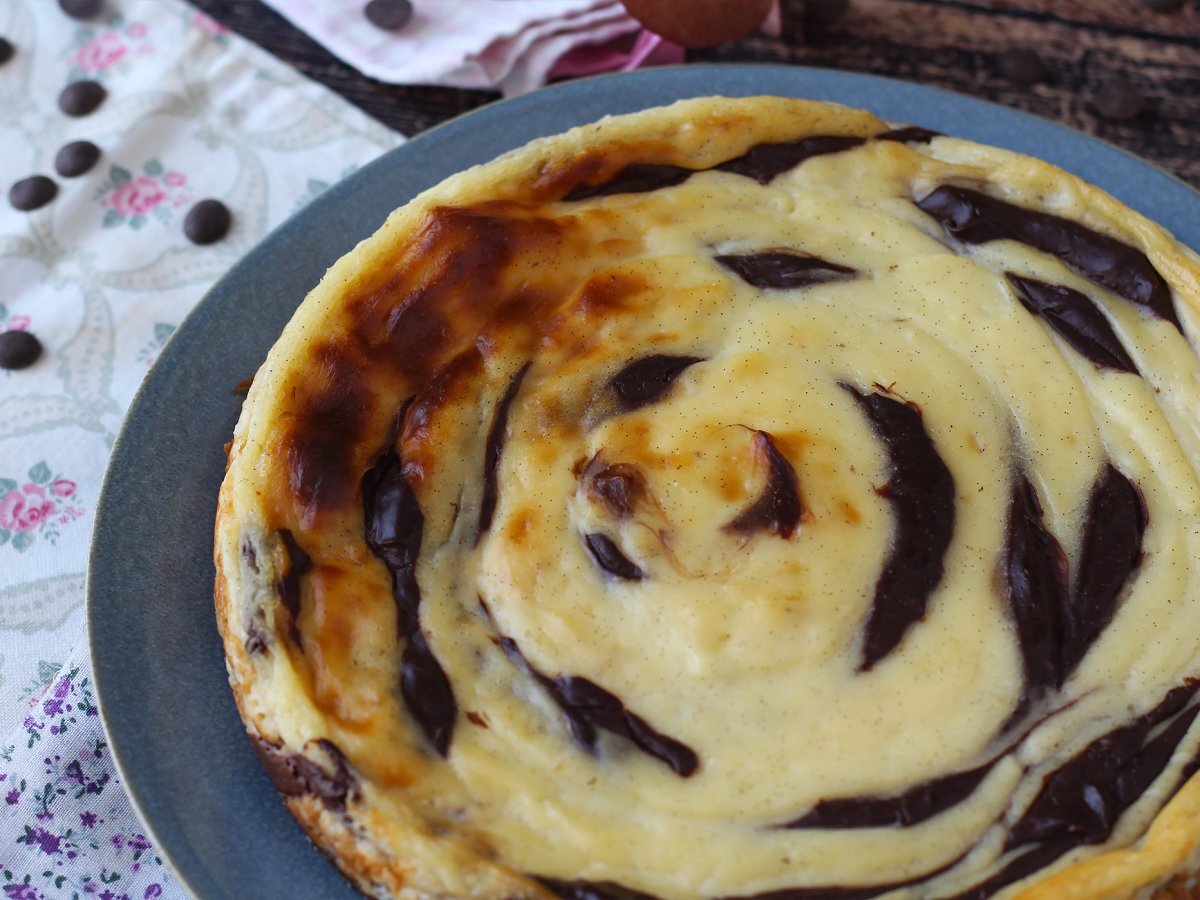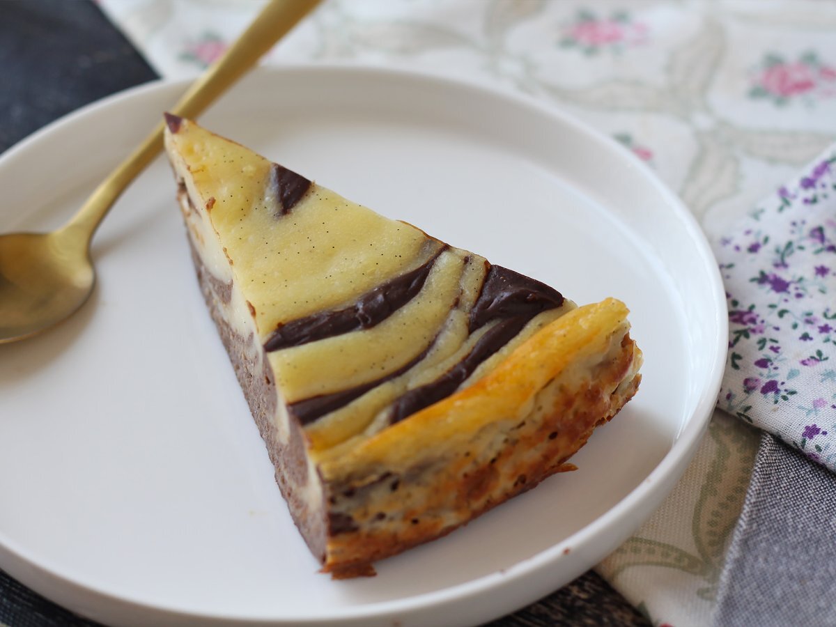 Puedes alternar cucharadas iguales de crema de vainilla y de chocolate en el molde, creando un efecto "cebra". También puedes distribuir las cremas de forma aleatoria y luego pasar un palillo o brocheta para hacer un marmolado más desestructurado.