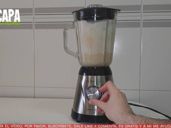 Ahora, mientras el caramelo se enfría, vamos a añadir en un vaso batidor, la leche, el azúcar, las galletas María, los huevos y 2 cucharaditas de extracto de vainilla y lo batimos bien hasta que no quede ningún grumo.