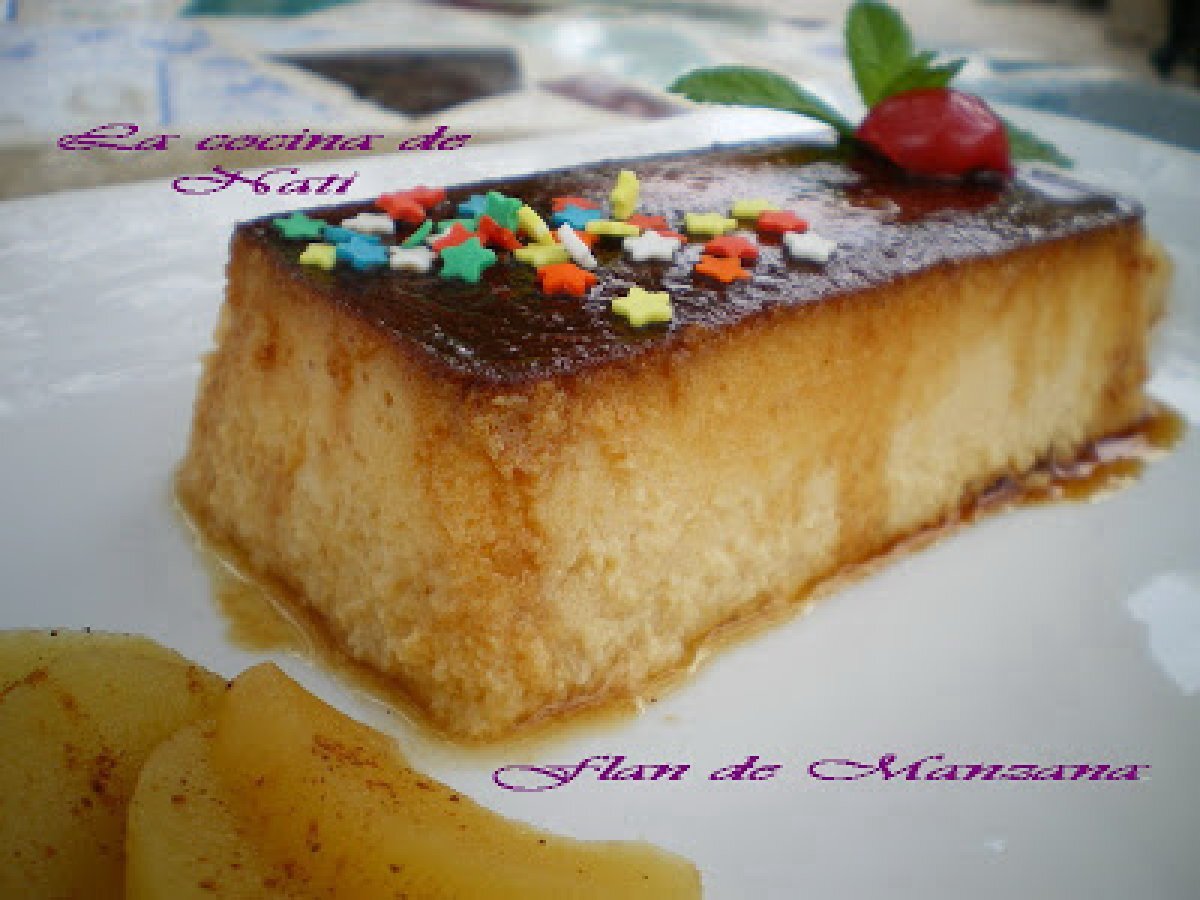 Flan de manzana y canela. AnteriorSiguiente PostreFácil1 hora Enviar esta receta a un amigo Imprimir esta página Preguntar al autor Publicar la foto de esta receta Ingredientes 4 500 g. de manzanas. El zumo de medio limón. 5 huevos. 150 ml. de leche condensada. 200 ml. de leche semidesnatada. 1 rama de canela. 1 copita de moscatel. Caramelo líquido.