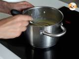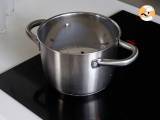 Retira la vaina de vainilla, vierte la leche caliente sobre la mezcla de huevos y azúcar, y remueve bien. Luego, vuelve a poner la preparación en el cazo y cocina a fuego medio hasta que espese, sin dejar de batir. Deja enfriar.