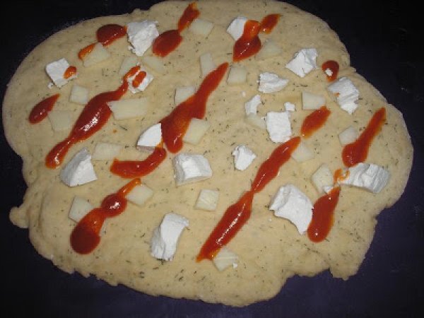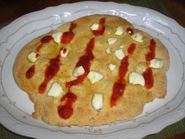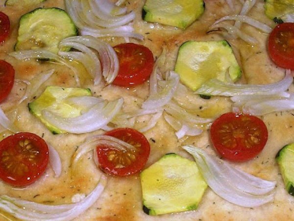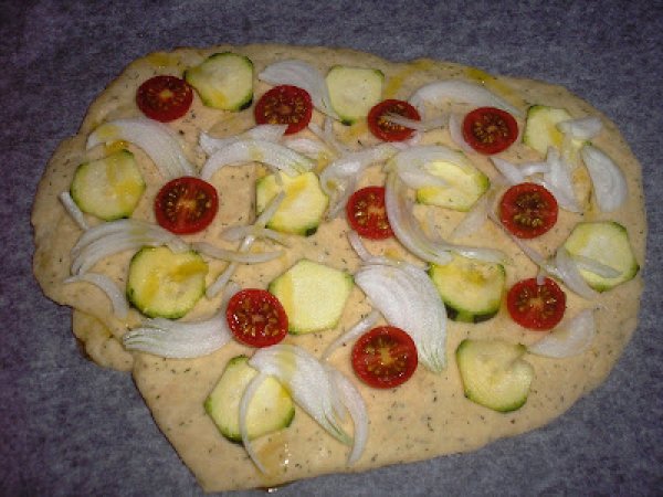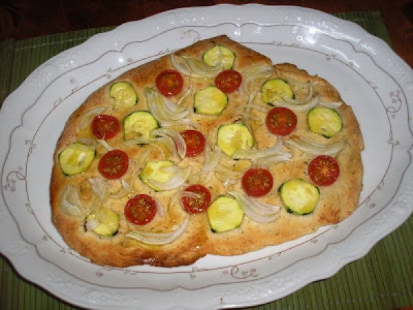 Focaccia de verdura y de queso AnteriorSiguiente PostreFácil1 hora Enviar esta receta a un amigo Imprimir esta página Preguntar al autor Publicar la foto de esta receta Relájese y disfrute de las vitaminas que ofrece esta receta. Ingredientes 4 para la masa: 300 g de harina, yo usé de fuerza, harimsa medio sobre de levadura seca tres cucharadas de aceite de oliva 100ml de agua una cucharadita de sal, de las de café una cucharadita de azúcar una cucharada de eneldo Para ponerle por encima aconsejaba: tomate a rodajas finas, cebolla cortada finamente calabacin a rodajas finas para cuando sale del horno, espolvorear sal gruesa y un chorreón de aceite de oliva.