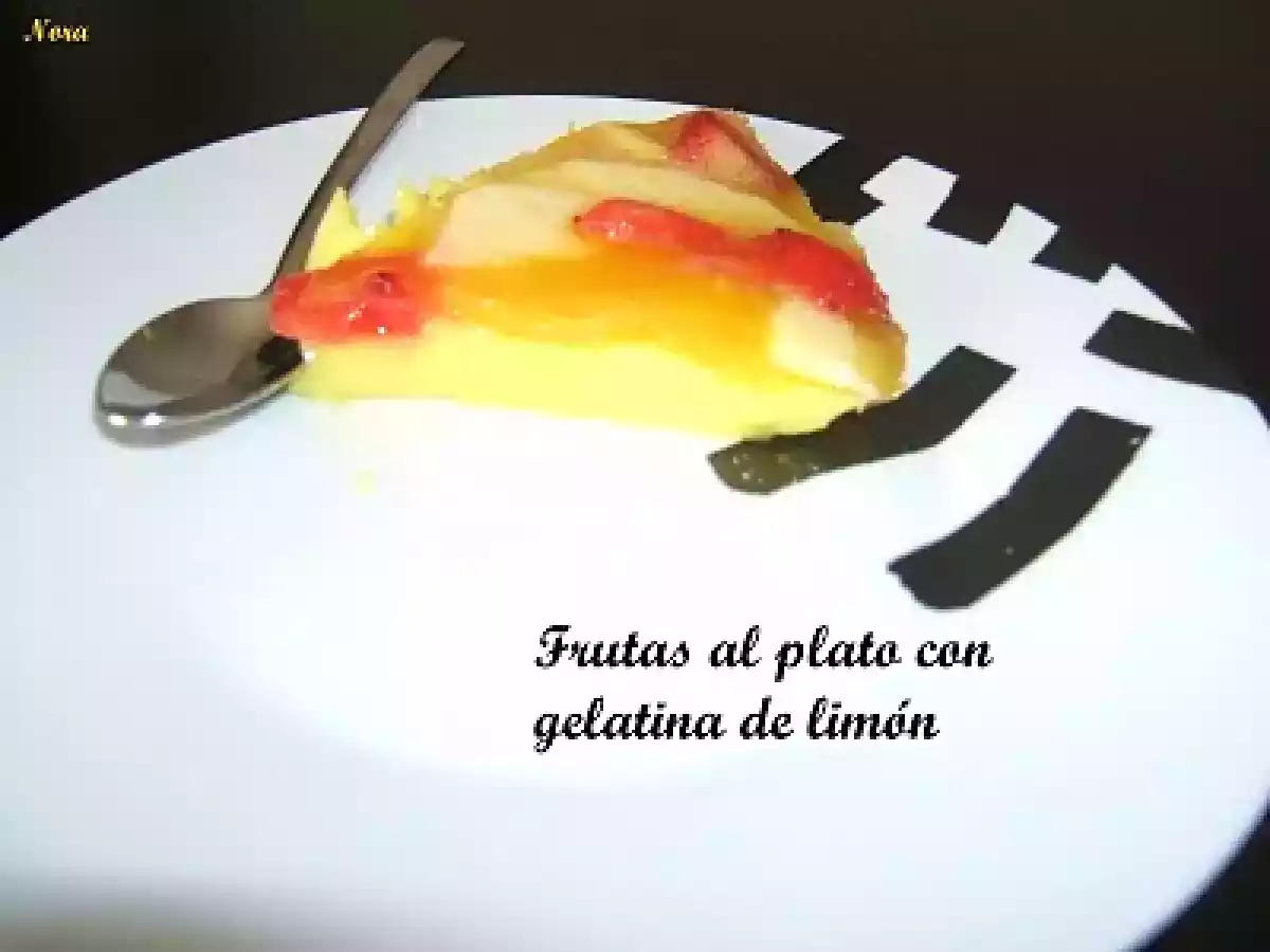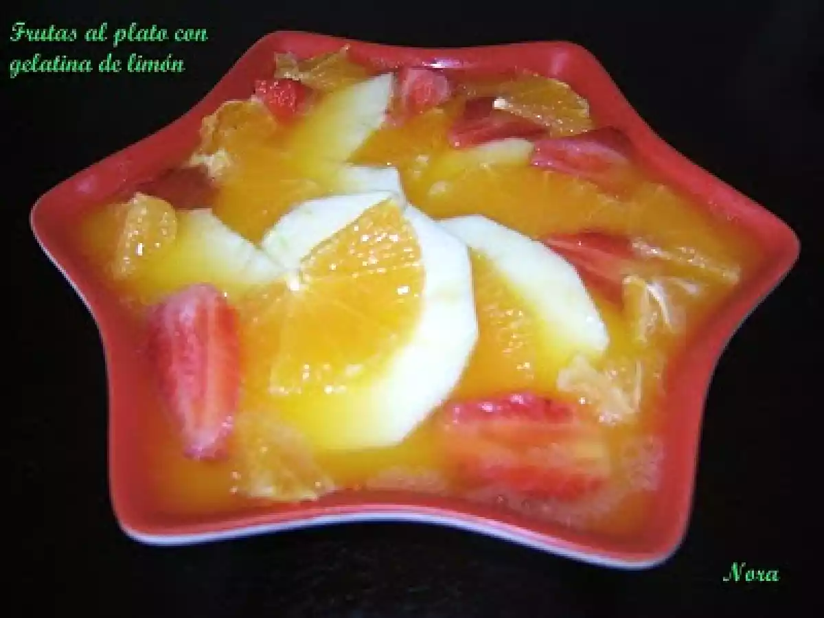 Frutas al plato con gelatina de limón AnteriorSiguiente PostreFácil30 min Enviar esta receta a un amigo Imprimir esta página Preguntar al autor Publicar la foto de esta receta Ingredientes 4 2 naranjas 5 ó 6 fresas 1/2 manzana 1 sobre de gelatina de limón 0% 250 ml de agua 2 yogures naturales desnatados 4 hojas de gelatina neutra