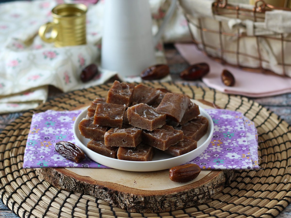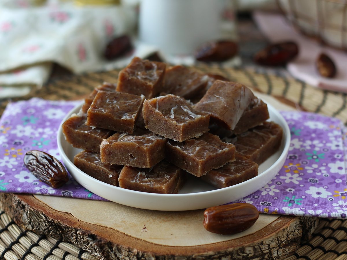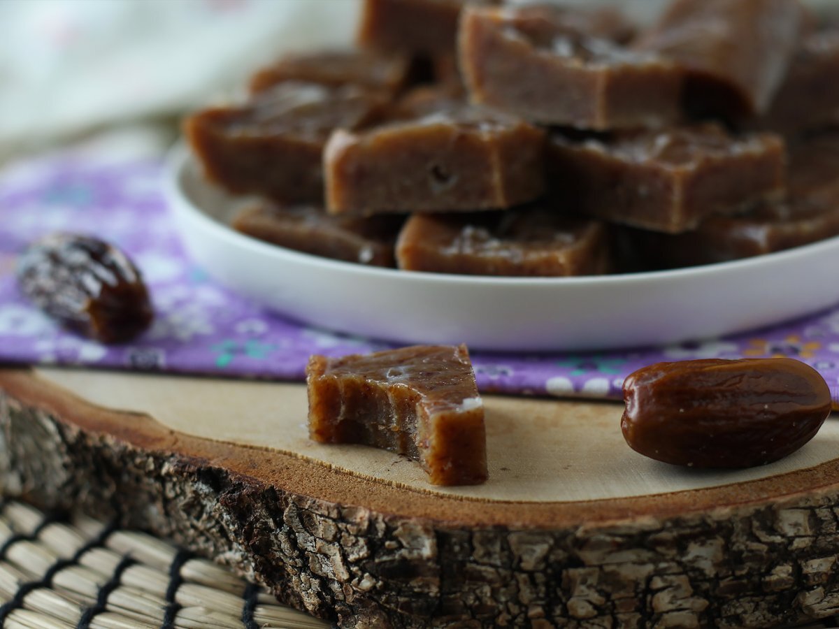 Fudge de dátiles, un bocado de caramelo blando, lleno de energía y sabor