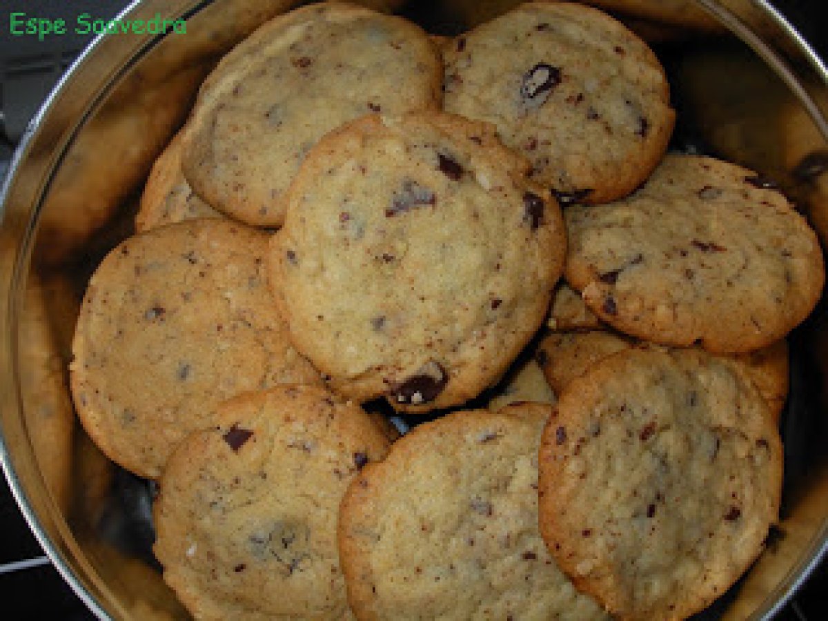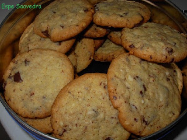 Galletas de almendras y chocolate AnteriorSiguiente PostreFácil25 min441 Kcal Enviar esta receta a un amigo Imprimir esta página Preguntar al autor Publicar la foto de esta receta Ingredientes 6 125 g mantequilla a temperatura ambiente 1/2 cucharadita esencia de vainilla 60 g azúcar glacé 60 g azúcar moreno 1 huevo pequeño 160 g harina de repostería 1/2 cucharadita bicarbonato sódico 50 g chocolate fondant 50 g nueces Costo estimado: 3.04Euros€ (0.51€/porción)