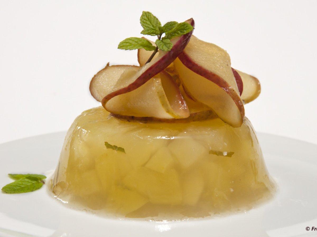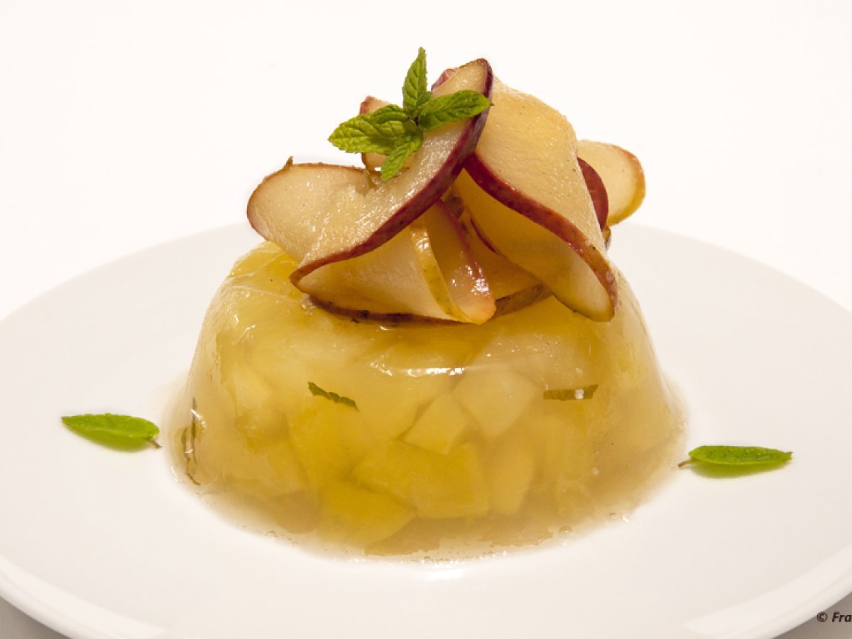 Gelatina de sidra con manzana y menta AnteriorSiguiente PostreFácil1 hora286 Kcal Enviar esta receta a un amigo Imprimir esta página Preguntar al autor Publicar la foto de esta receta Ingredientes 6 20 g de gelatina sin sabor ½ l de sidra 2 manzanas hojas de menta 2 tazas de agua 1 taza de azúcar 3 peras 1 cucharada de limón 1 cucharada de mantequilla Costo estimado: 5.84Euros€ (0.97€/porción)