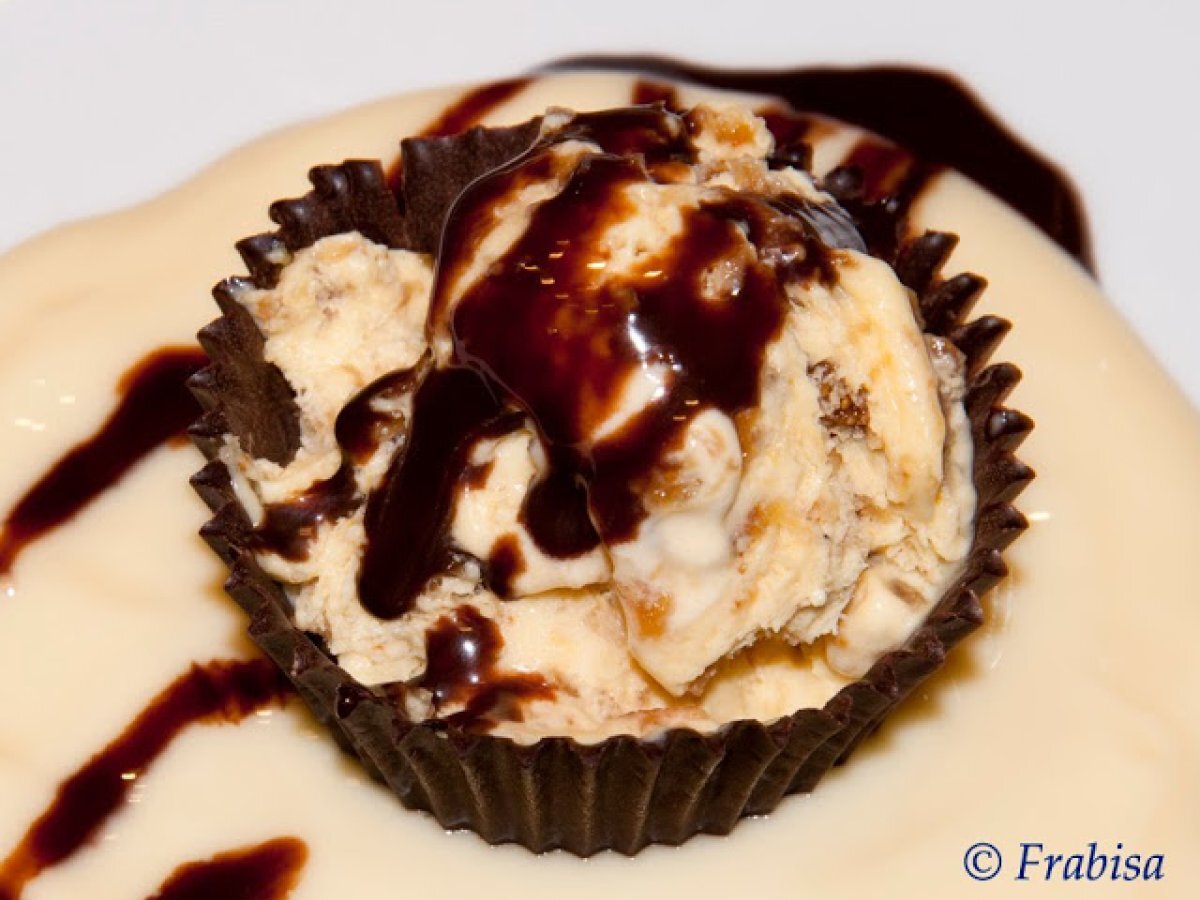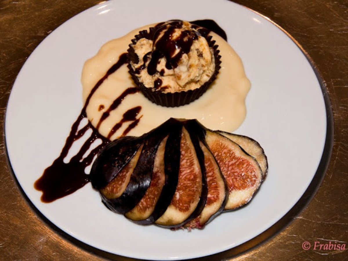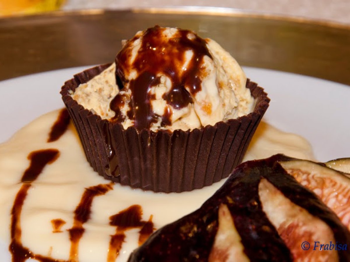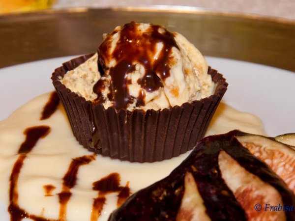 Servír en unas cápsulas de chocolate que hice para el efecto y lo acompañé con higos frescos, sobre una base de natillas y salsa de chocolate.