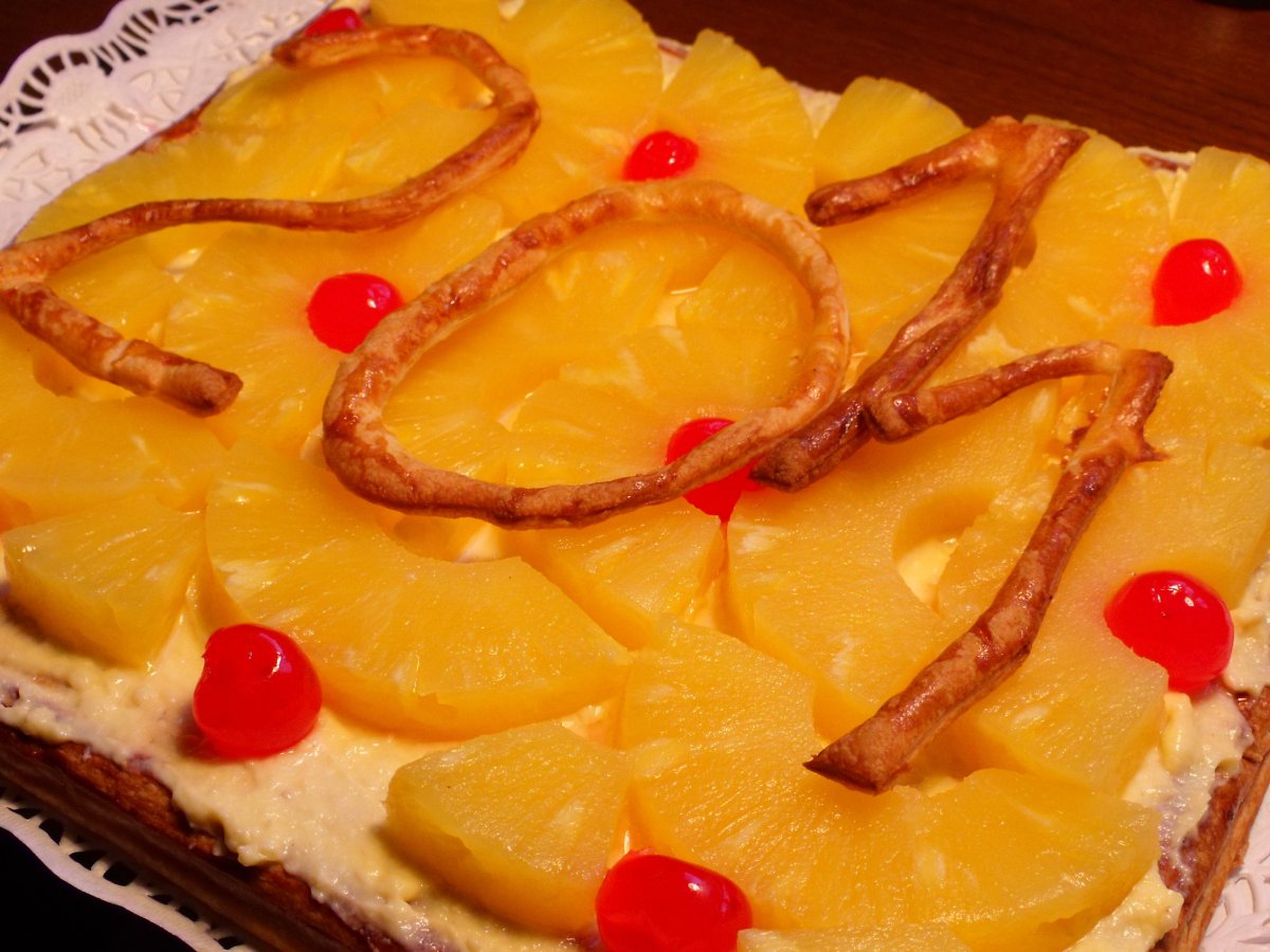 Hojaldre con crema y piña PostreMedio1 h 10 m341 Kcal Enviar esta receta a un amigo Imprimir esta página Preguntar al autor Publicar la foto de esta receta Ingredientes 8 1 làmina de hojaldre 1 huevo 1 bote grande de piña en almibar cerezas en almíbar Para la crema pastelera 500 ml de leche 20gr maicena 30gr harina 5 yemas de huevo 120 gr de azucar 1 cucharadita de azucar avainillado 30 gr mantequilla Costo estimado: 4.84Euros€ (0.6€/porción)