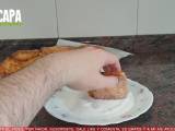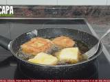 Cuando ya han pasado unas horas, añadimos un buen chorro de aceite en una sartén y dejamos que se vaya calentando. Mientras se calienta el aceite, sacamos la masa de la nevera y cortamos unas porciones de la masa, el tamaño de las prociones es a gusto de cada uno. Ahora cogemos las porciones y las vamos pasando por harina, podéis utilizar harina de trigo, maicena, lo que queráis… después lo pasamos por huevo batido… que se empape bien por todos lados y los freímos a fuego medio. Dejamos que se doren por las dos caras y las dejamos en una bandeja con papel absorbente para que absorba el exceso de aceite.