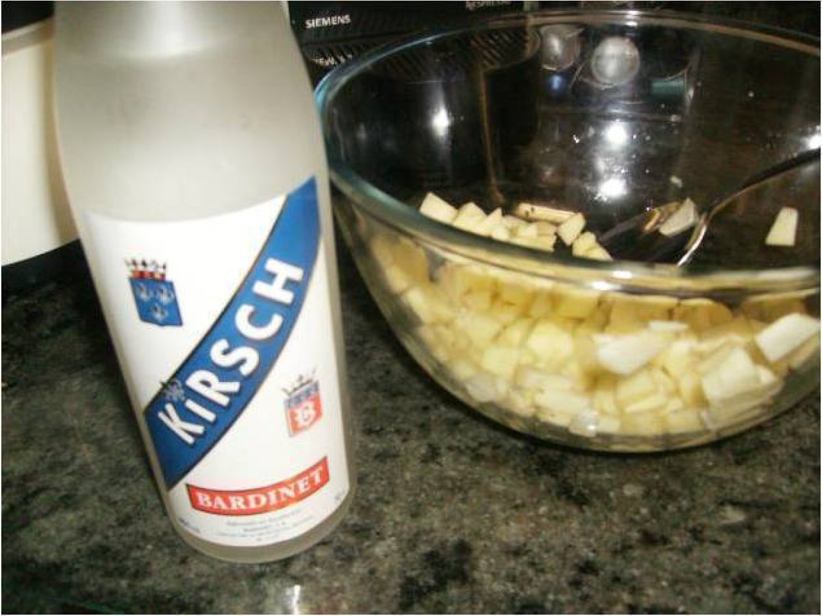 El kirsh es simplemente licor de cerezas. Si no lo encuentras por tu zona puedes usar el líquido que viene en las latas de cerezas en conserva. No queda exactamente igual pero es una buena solución.