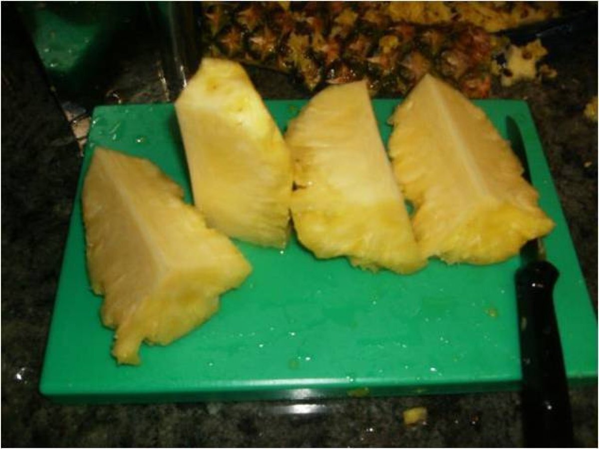 La piña la pelamos y quitamos el tronco del centro y en cuadraditos pequeños el mismo tamaño de todas las frutas.