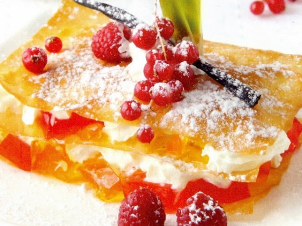 Mil hojas de natilla y frutos del bosque PostreFácil30 min758 Kcal Enviar esta receta a un amigo Imprimir esta página Preguntar al autor Publicar la foto de esta receta Ingredientes 2 2 planchas de pasta filo 4 cucharadas de frutos rojos 1 piña 4 cucharadas de agar-agar 1 nuez de mantequilla aceite de oliva 2 natillas ligeras de vainilla 3 cucharadas de azúcar glas Costo estimado: 18.53Euros€ (9.27€/porción)