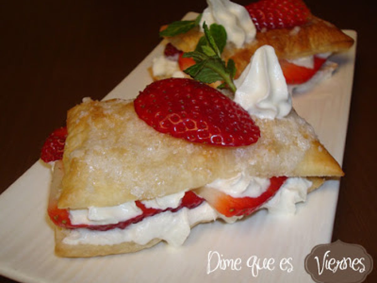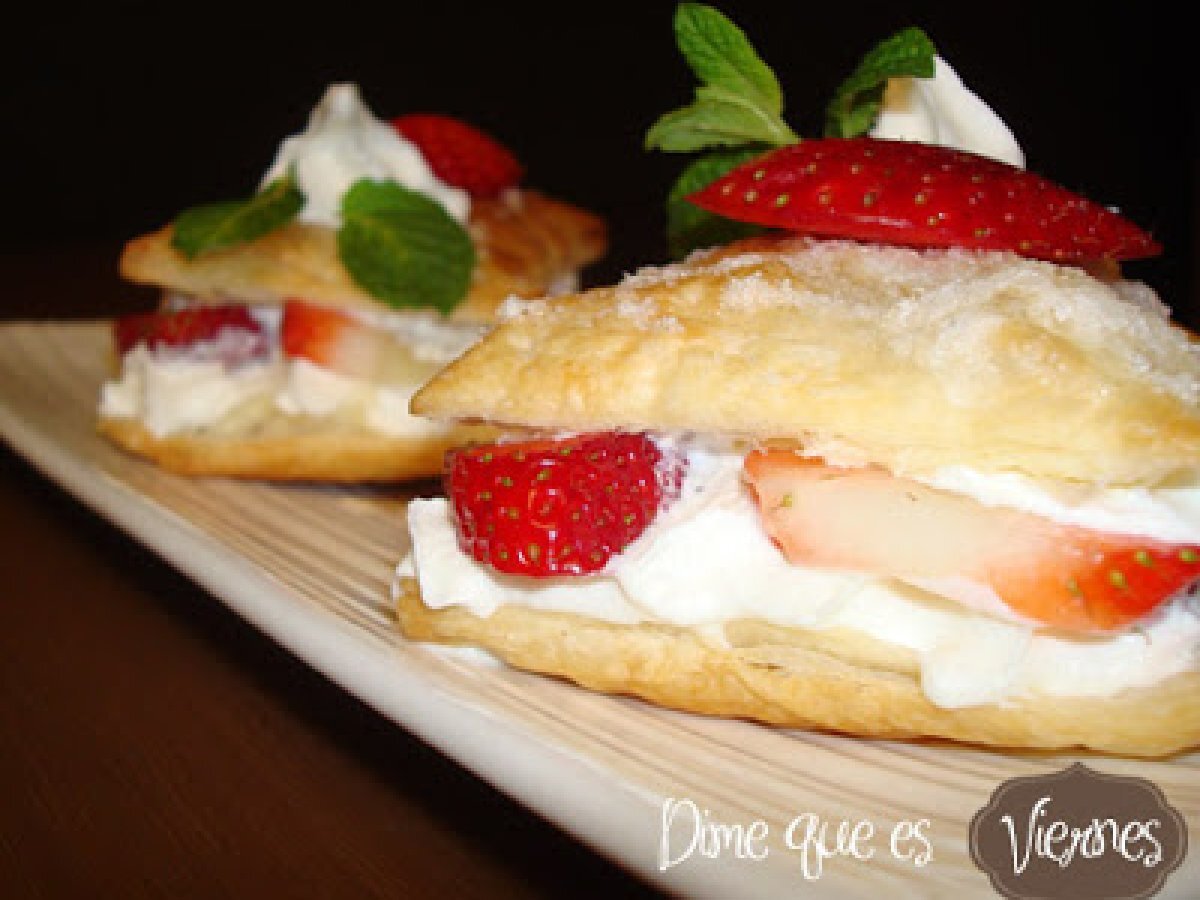 Milhojas de fresas con nata AnteriorSiguiente PostreFácil55 min677 Kcal Enviar esta receta a un amigo Imprimir esta página Preguntar al autor Publicar la foto de esta receta Ingredientes 2 una lámina de hojaldre fresones nata montada un poco de azúcar unas hojas de menta fresca