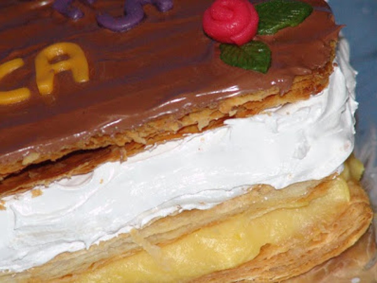 Milhojas de merengue italiano y crema pastelera AnteriorSiguiente PostreFácil1 h 5 m Enviar esta receta a un amigo Imprimir esta página Preguntar al autor Publicar la foto de esta receta Ingredientes 3 3 planchas de hojaldre 500 g de crema pastelera merengue italiano hecho con 150 g de claras Cobertura glasse de chocolate (una clara ,+ O - unos 180 g de azúcar glas y cacao puro al gusto) Adornos al gusto