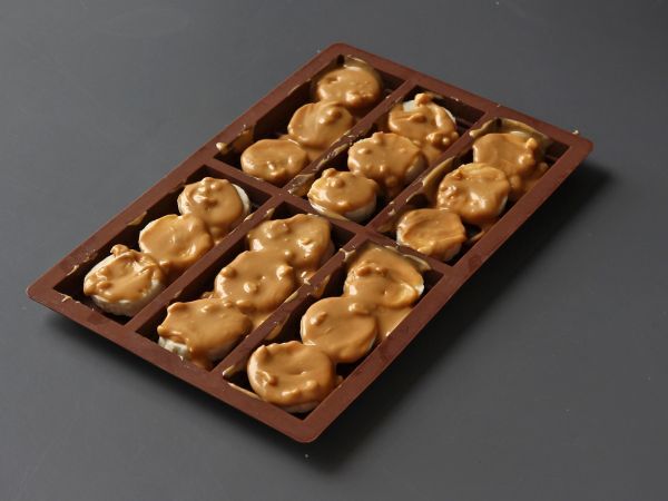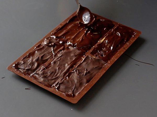 Funde el chocolate negro al baño maría o en intervalos cortos en el microondas. Vierte una capa de chocolate fundido sobre cada cavidad, cubriendo bien el relleno. Devuelve el molde al congelador durante al menos 15 minutos, o hasta que el chocolate haya endurecido por completo.